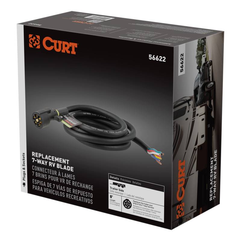 Like trailer hitches and ball mounts, electrical connectors range all over the board in shape, size and capability, but no matter what your trailers electrical functions are, you need a solid connection to keep the power flowing and ensure safety on the road. CURT electrical connectors are designed and manufactured to give you a reliable connection every time you plug in your trailer. This 7-way RV blade replacement harness is designed to replace an existing 7-way plug on your trailer and supply power for tail lights, turn signals, electric trailer brakes, a 12-volt battery, reverse lights and brake lights, as well as a ground connection. It features color-coded wires for easy splicing into your trailers wiring system. With an 8 cable and protective plastic sleeve, this harness is perfect for RV travel trailers, providing more than enough length to accommodate your vehicle-trailer combination and maintaining a solid electrical connection in spite of the elements. This 7-way RV blade connector is a male-end plug, specifically designed for the trailer side of the connection.