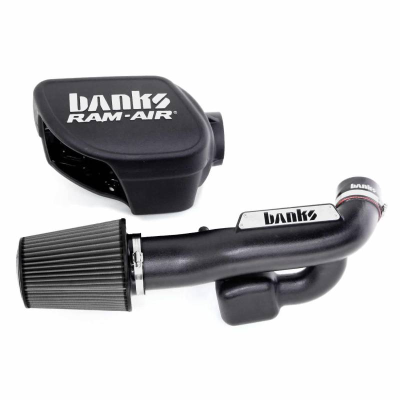 Banks Ram-Air Cold-air intake with large lifetime filter, enclosed housing and large tubing offers huge improvements over stock flow, increasing power and fuel economy. Tuned Helmholtz resonator eliminates engine drone. Banks Ram-Air Superiority: The Banks Ram-Air Intake System replaces the factory's flat panel filter with a large conical filter that provides maximum high-flow filtration. The Ram-Air's opening dwarfs the stock's inlet size, and is without the 90-degree bends and detours that choke airflow and kill power. The huge inlet, enclosed housing and much larger tubing reduce restrictions, dramatically improving airflow to the cylinders. Another key element is the tuned "Helmholtz" resonator which eliminates engine drone while maintaining a throaty sound. Key Features: Enclosed housing keeps out hot, power-robbing engine air. Tuned Helmholtz resonator eliminates engine drone. Inhales cooler outside air for more power & MPG. Extends service life and requires fewer cleanings. Giant filter maximizes high-flow filtration. Accommodates engine movement. Gains of +8 hp and +11 lb-ft Extensively tested & validated. Prevents component damage. 5-year Limited Warranty. Helps engine run cooler. OILED or DRY Air Filter Element Gain +8hp/+11lb-ft, 64% Less Restrictive. Tuned to eliminate drone
