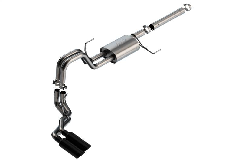 Cat-Back Exhaust System - S-Type This 3" diameter into dual 2.25" Borla(r) Cat-Back(tm) system was specifically designed to enhance the power and sound of the Ford F-150 equipped with the 3.5L PowerBoost engine. This system features the classic S-Type sound with no drone. It has a dual passenger side exit configuration with single 4" round black chrome on T-304 stainless steel tips on each tail pipe. Using Borla(r) Stainless Steel Polish p# 21461 is NOT recommended with these black chrome tips. We suggest cleaning the tips with hot water and a microfiber cloth. It is also available with bright chrome on T-304 stainless steel tips. Add Adapter 60556 For Crew Cab With Standard Bed (6' 7") 157.2" Wheelbase vehicles. The entire system is made of T-304 stainless steel and utilizes computer numerical control (CNC) manufacturing techniques that ensure an accurate fit. All this is backed by our unsurpassed Million Mile Warranty. System Features: Cat-Back(tm) System, Dual Side Exit, 4" Round Black Chrome On T-304 Stainless Steel Tips, S-Type Sound Level, T-304 Stainless Steel Construction, Bolt-On Installation, Million Mile Warranty. Fits PowerBoost models Add Adapter 60556 For Crew Cab With Standard Bed (6' 7") 157.2" Wheelbase vehicles
