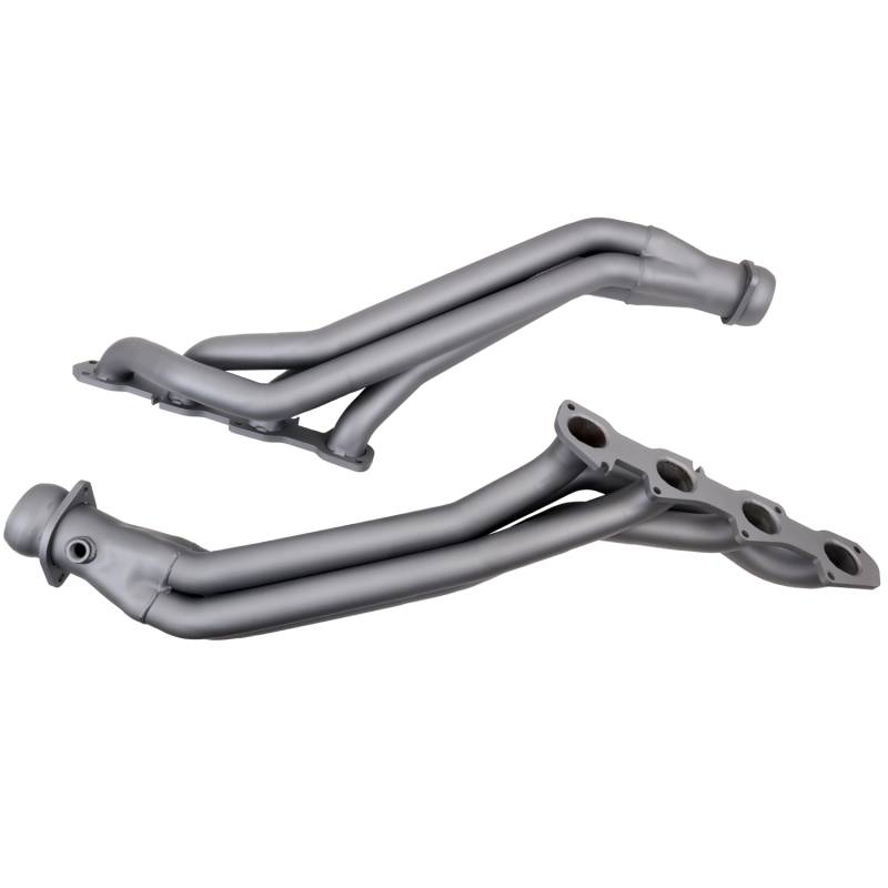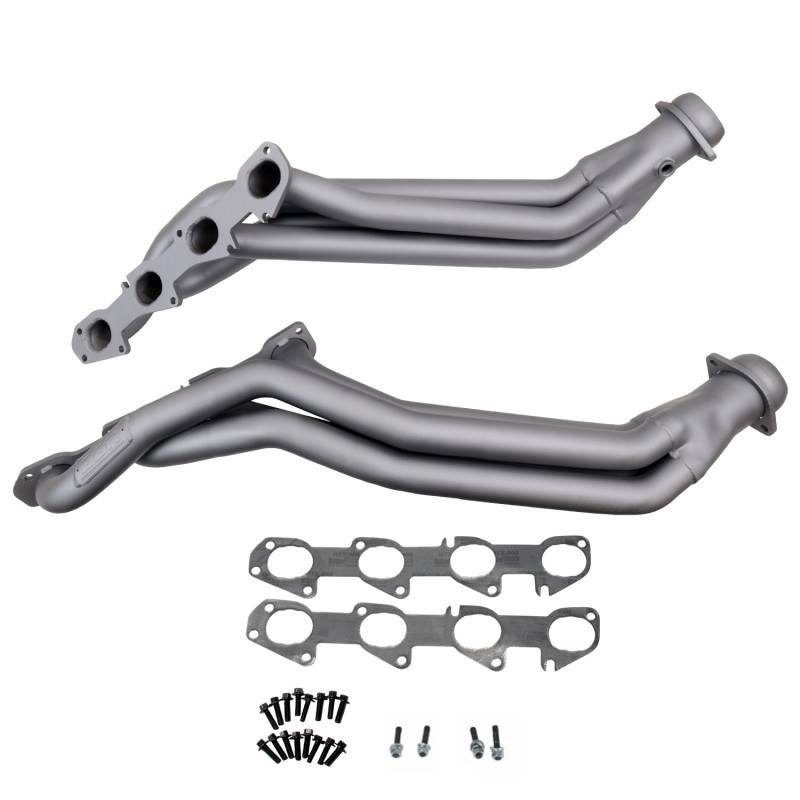 These BBK Performance 1-7/8 full length long tube exhaust headers offer unsurpassed quality and fitment using top quality materials and American craftsmanship. Every long tube exhaust header system is hand built with CNC mandrel bent tubing for unrestrictive exhaust flow and maximum performance, 3/8" laser cut flanges, patented scavenging collector design and gasket less ball and socket connectors for easy installation. Every exhaust header has been designed specifically for your application to get the most horsepower and torque out of the engine. BBK long tube exhaust headers outperform the competition in quality value and performance. All headers are a direct fit bolt on replacement when used with the correct matching mid-pipes which are available with high flow catalytic converters. Our decades of exhaust design and experience make BBK Performance your number one choice for late model American car and truck performance exhaust. Require Mid Pipe Part # 16481 to complete installation to cat back exhaust. Titanium Ceramic Finish - Kits Include New Gaskets And Hardware - CNC Mandrel Bent Primary Tubes For Maximum Flow and Performance