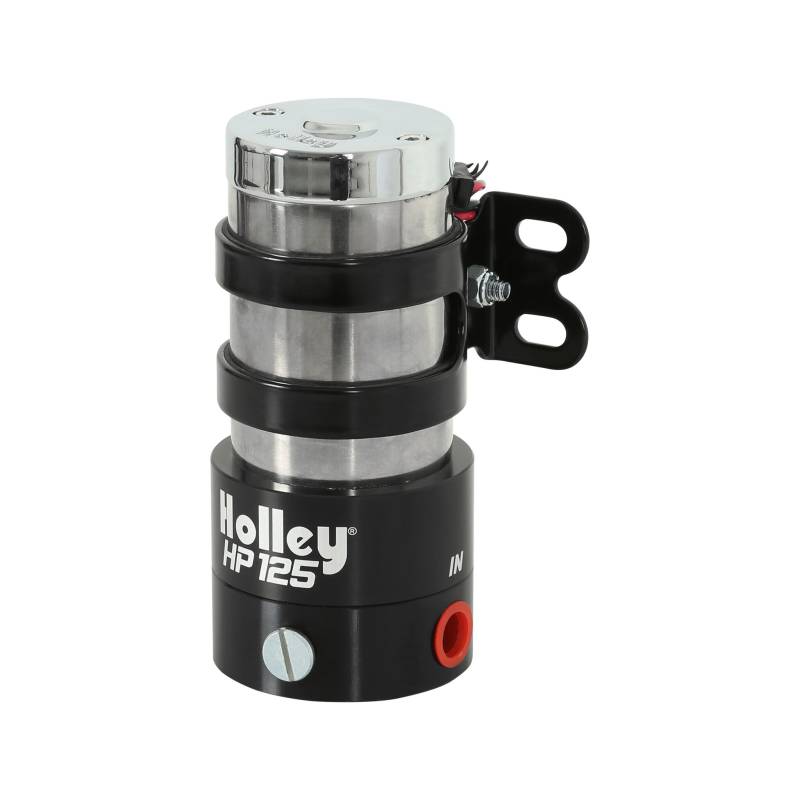 Looking for a fuel pump that is quiet, stylish, powerful and dependable? Look at the Holley HP 125 and HP 150 series fuel pumps. The exclusive gerotor gearset quietly and efficiently pumps the fuel without the noise of traditional vane pumps.\nThe chrome motor and trick powder coated bracket match the mil-spec hard anodized base for unmatched beauty and durability. While these pumps have the capability to feed stout race engines, they are equally at home on the street due to their design and construction techniques.