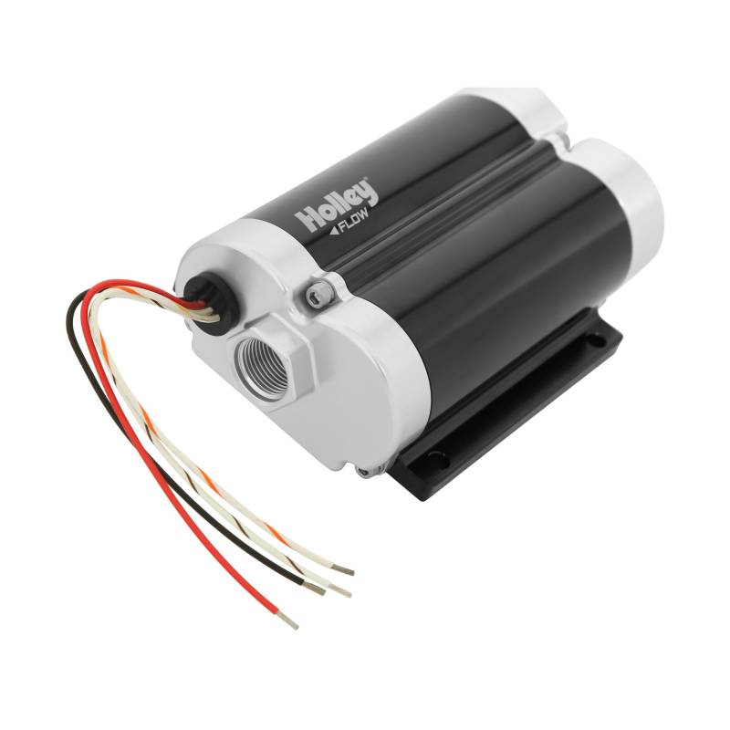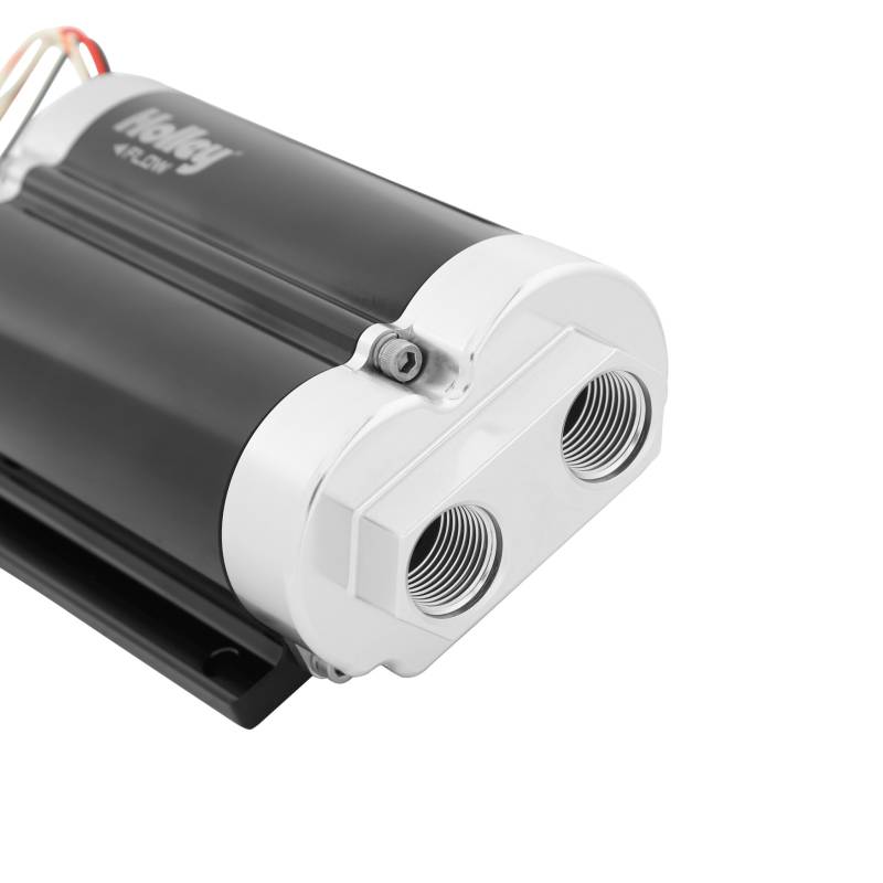 Need to feed some serious horsepower? Have a nitrous or forced induction powerplant that also sees street duty? Holley's Dominator in-line fuel pumps are the answer! The patent pending twin pump design allows you to use one pump for cruising and both pumps when you activate the nitrous switch or start building boost! By staging the second pump, you eliminate the unnecessary recirculating and heating of extra fuel which can lead to poor performance and hot fuel issues.\nAs an added benefit for the hard core enthusiasts that run events like Hot Rod Power Tour and the Baja 1000, the extra pump offers the peace of mind that you will always finish what you start! For hard core race vehicles, both pumps can be wired for full time duty to get maximum performance and are proven with 18.5 volt compatibility at pressures up to 80 psi.\nHolley engineers have designed 12-1600-2 to feature improved hot fuel handling capabilities. It was designed to greatly reduce the negative effects of heated fuel now common with many of today's pump gas blends. It is available for use with pump gas or race gas. If you are using E-85 or diesel, no need to worry, Holley has still got you covered with the 12-1800 Dominator Fuel Pump. At only 5.1 lbs, they weigh half a pound less than competitive 1000+ horsepower pumps yet have twice the features!