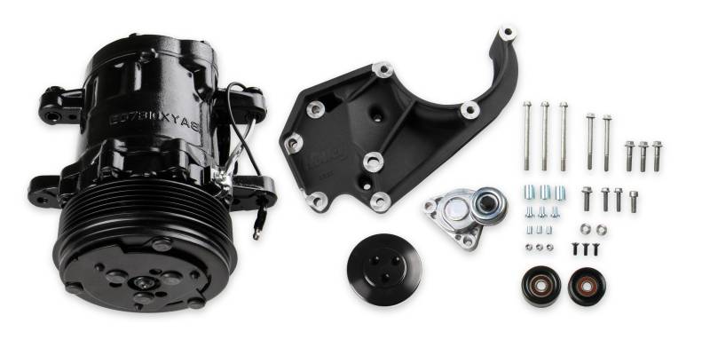 Now available from Holley are complete A/C kits finished in black that have everything needed for the application. Already have the P/S pump and alternator system from the donor truck or car engine? These complete A/C brackets kits move the compressor up high and away from the frame rail (no more notching!). Included are compressor, pulleys, and tensioner that are manufactured by OE part suppliers many of which are on production cars today.