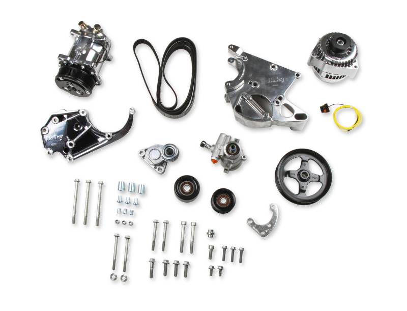 Now available from Holley are complete kits in polished finish that have everything needed for the application including the belt. Included are accessories, pulleys, tensioner, and belt that are manufactured by OE part suppliers many of which are on production cars today.\nReplacement hardware kit is 97-171