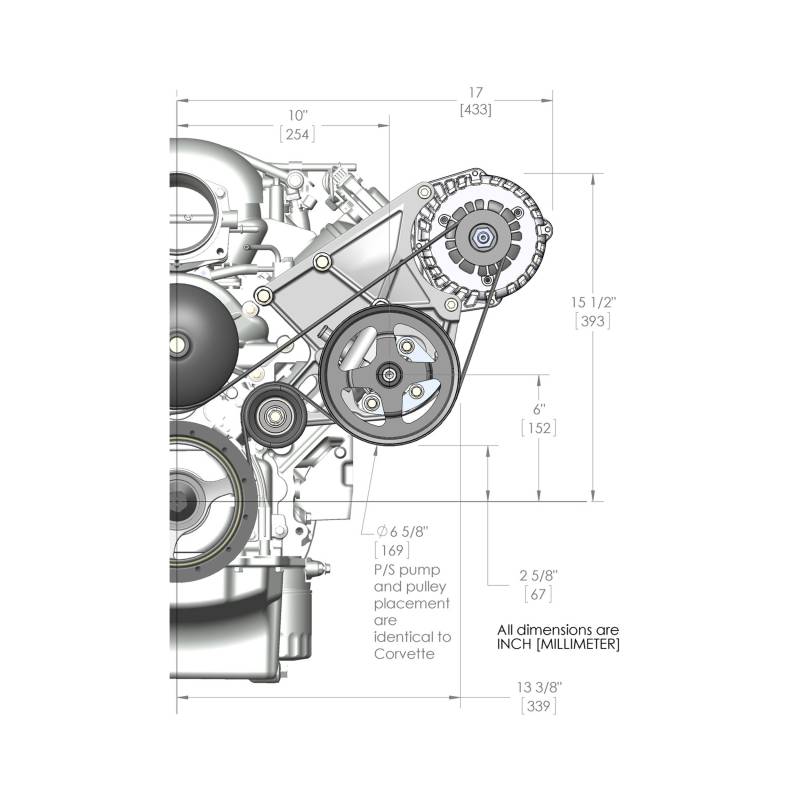 Now available from Holley are complete kits- black finish that have everything needed for the application. If you don't want A/C, or want to use the factory mounted LS A/C, this is the complete drivers side P/S, Alternator kit for you. Included are accessories and pulleys that are manufactured by OE part suppliers many of which are on production cars today.
