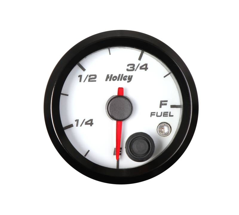 Holley's analog-style standalone fuel level gauges give you a simple yet modern way to monitor your fuel level and are fully programmable for a variety of factory and aftermarket sending units. Their slim style mounting requires very little dash space depth for mounting. All of our gauges feature dimmable LED backlighting to ensure you can always see the gauge no matter the environment. Each gauge is tested to insure a top quality and accurate gauge. The Holley gauges are designed for a 2-1/16" opening and available with black face with white lettering or white face with black lettering.