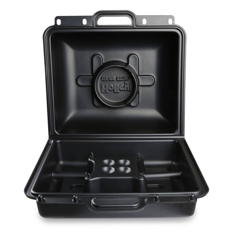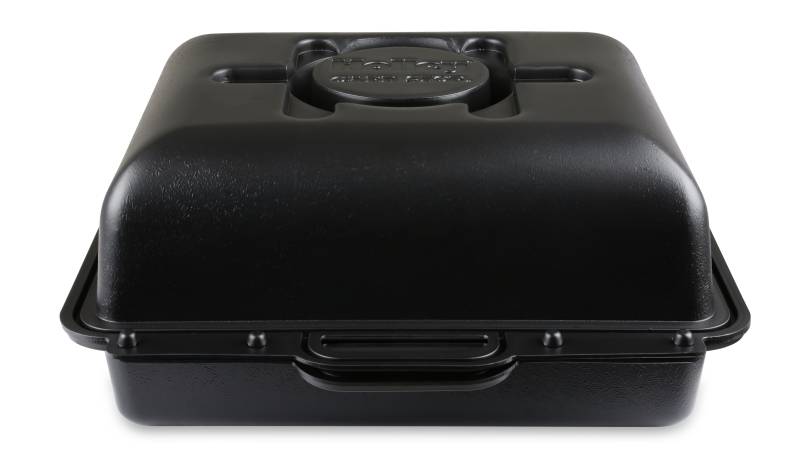 Treat your carburetor to some TLC with this handy, yet practical carburetor carrying case. Made of durable plastic, it is designed to securely hold and protect your carburetor during storage or transportation. There's even room enough to accomodate a dual feed fuel line, so it need not be disconnected from the carburetor. A neat carrying handle rounds out the package and adds convenience. Locking tabs promote security. This case can hold a Holley model 2300 carburetor or any of the square flange four barrels.