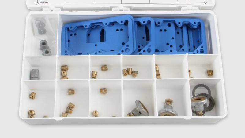 This tuning kit contains a selection of main jets, pump nozzles and power valves, in popular sizes, all contained in a handy and durable, compartmentalized plastic case. Ideal for track-side tuning, this kit provides a quick and easy way to accomplish your carburetor tuning with the correct parts. In addition, the parts case allows you to keep parts organized and readily at hand. A handy parts guide is affixed to the inside case cover. Numbers referenced on the parts guide will assist in reordering components when necessary. Gaskets are included to facilitate carburetor reassembly.