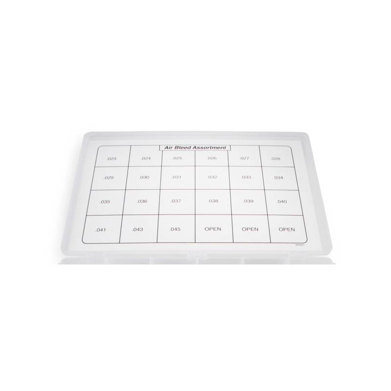 This air bleed kit is a must when track-tuning a Holley® 4500 DOMINATOR® or Model 4150HP carburetor for maximum performance.\nThe kit includes four (4) each of the following bleed sizes: 23-41, 43, 45, 47, 49, 51, 53, 55, 57, 59, 61, 63, 65, 67, & 69-78. Air bleeds are contained in a plastic case that is designed to be read with the top open, keeps them separated and makes them easily accessible.