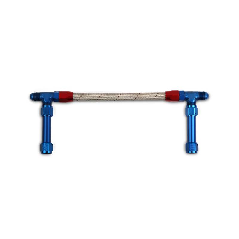 Dual fuel lines for Holley Gen 3 Dominator Carburetors w -8 O-ring HP Bowls. Fuel line with dual 8AN inlet, Red & Blue fittings with Stainless hose