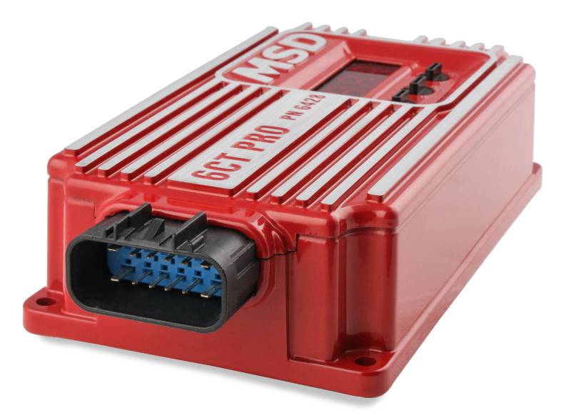 Rev limiting is controlled via microprocessor making it'so smooth the chassis is virtually undisturbed when charging into turns. The rotary dials are also used to set cylinder select for 4, 6, and 8 cylinder engines, and to adjust the built-in start retard providing options of 0?, 10? or 20? of timing retard for quick starts. As an added bonus, the LED display can be used as a live tach or will display your racecars battery voltage. The unit records the highest RPM your engine turned during the race, which can be recalled easily on the LED display and is quickly reset using a remote, momentary switch. The 6CT PRO offers all this and more in a fully potted housing that utilizes a single connector to keep wiring tidy.\nBased on the superior design of the MSD 6CT, the 6CT PRO adds another offering to MSD's line of technologically advanced ignitions for circle track racing. Packed with legendary MSD Ignition power, the 6CT PRO offers a slew of features. A large digital LED display makes it easier than ever to see the rev limiter setting when dialing it in using the laser etched rotary dials on the face of the unit.