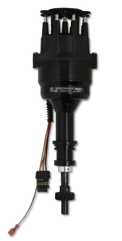 The Ready-to-Run Distributors are a breeze to install. Simply drop it in the engine and connect three wires and you're ready-to-run across the lake! Supplied with a cap, rotor, gear and Weathertight wiring harness.\nMSD's Ready-to-Run Marine Distributors are the perfect upgrade for boats that are relying on worn-out breaker points or weak ignition systems. Built off our tried and true billet marine distributors, the 6061-T6 aluminum housing is now hard anodized with a sleek black finish for great looks. This module produces a stout inductive spark that will improve combustion of the fuel mixture for better drivability.\nBeneath the durable bolt-down, injection-molded cap, a maintenance-free magnetic pick-up produces accurate trigger signals while an oversized shaft is guided by a sealed ball bearing. An easy-to-adjust mechanical advance allows you to custom tailor a timing curve to match your application.