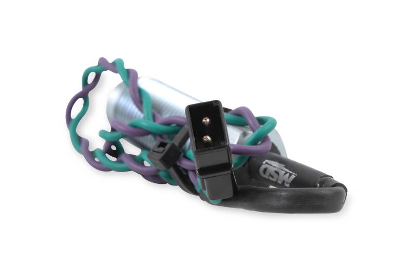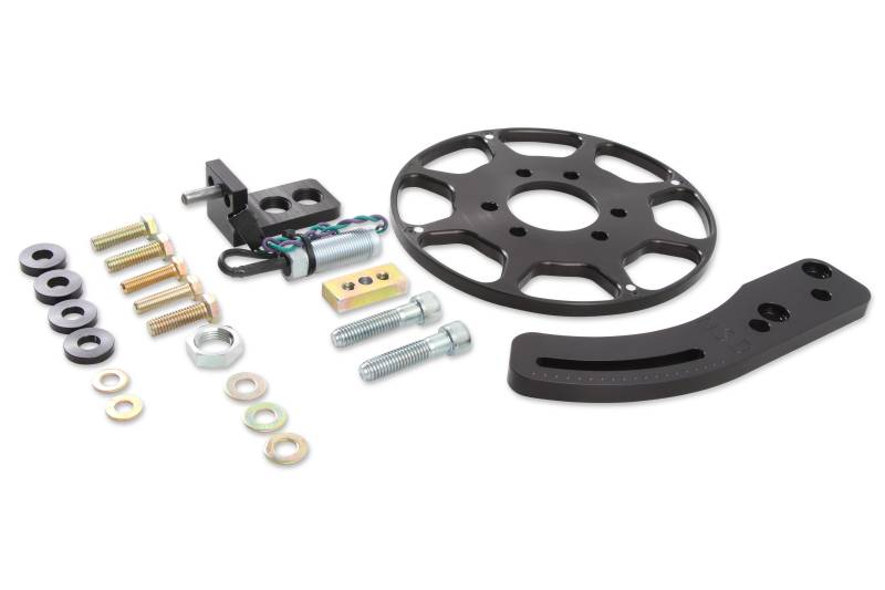 For a long time, racers have known that one of the best things to do to an engine to improve performance is to stabilize the ignition timing. The MSD Flying Magnet Crank Trigger system does exactly that by using four magnets embedded in an aluminum wheel. Although similar in appearance to other crank triggers, the MSD Flying Magnet design works on a different principle. Most crank triggers have a wheel, with steel studs sticking out, bolted to the harmonic balancer. As the crankshaft turns, the studs pass by a stationary magnetic pick-up, triggering the ignition. This pick-up can be triggered by other bolts, debris, or even vibrations which will cause a loss of power or engine damage.\nThe MSD Flying Magnet Crank Trigger uses four magnets secured in the aluminum trigger wheel that pass by a stationary non-magnetic pick-up to trigger the ignition. This "flying magnet" design produces accurate trigger signals and the non-magnetic pick-up cannot be falsely triggered. Each Flying Magnet Crank Trigger includes a two-piece mounting bracket for the non-magnetic pick-up that in most cases will work on either the passenger side or driver's side of the engine (the SB Chrysler and SB Ford brackets mount on only one side). The CNC-machined aluminum bracket securely holds the pick-up in place and is slotted to provide a wide range of timing adjustments. Spacers are included so you can mount the bracket on engines with standard motor mounts or engines with a .25" motor plate. These systems will trigger MSD 6, 7, and 8 Series Ignitions and all MSD Timing Accessories.