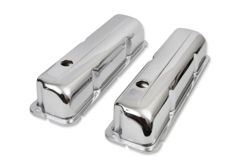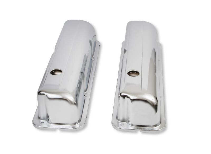 These Mr. Gasket chrome plated stamped steel valve covers have a flat smooth top, and internal baffles. Fits Ford 332,360,390,406,427,428. Sold as a pair.