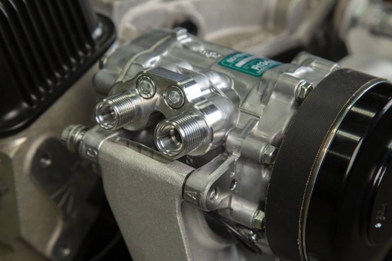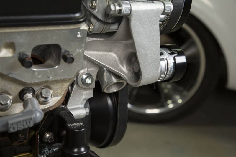 Holley's Mid-Mount accessory drives are now available for your small block Chevrolet engines! The revolutionary system does what no other accessory bracket system has done… GETS RID OF THE BRACKETS!\nThe Mid-Mount complete accessory system has all accessories pulled in tighter than other accessory drives. At the heart of the system is a "bracketless" design, where the accessories bolt directly to the water pump for a clean, integrated form. The design offers superb engine visibility to show off your horsepower, not your accessories. The Holley designed alternator is just as innovative. This premium alternator utilizes 6-phase technology as found on the C7 Corvette. The water pump also shares its design efficiencies with that of the C7 Corvette. The compact and reliable SD7 A/C compressor and Type II P/S pump with baffled reservoir are also integrated.\nThe water pump design incorporates optional side or top heater ports. The top thermostat bypass and heater ports are recessed into the manifold. So if you don't need them, you don't see them!\nWhen we say "complete", we mean complete. The Mid-mount system comes with everything you need. All accessories are included, the water pump, A/C compressor, Alternator, and P/S pump with reservoir. All pulleys and the belt are supplied. Even A/C line adapter, heater hose adapters, power steering to -6 AN hardline, and the alternator plug/harness are included. Easy assembly was a priority during the entire development of this accessory solution. Color graphical instructions walk you through every step of the ultra-easy installation.\nPatent - www.holley.com/patents/