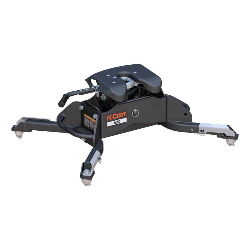 A20 5th Wheel Hitch, Select Ram 2500, 3500, 8' Bed Puck System The CURT A20 5th wheel hitch offers smoother, quieter towing for your home-away-from-home, combining the patented technology of our A-series, an easier mounting system and the power of a 20K 5th wheel hitch. Like our A16 hitch, this 20K 5th wheel hitch uses a patented cast yoke to allow for unimpeded head movement, while providing exceptional stability for the trailer. The yoke has a set of poly-torsion inserts to suppress shock loads and reduce excessive noise, and the head features high-strength, interlocking jaws to give the trailer stability and the freedom to pivot and swivel as needed. This A20 5th wheel hitch also comes with a set of CURT OEM puck system 5th wheel legs designed to be mounted on a Ram truck with the truck bed puck system. The legs mount directly into the four-point mounting system, allowing the CURT A20 hitch to be installed quickly and easily. The most unique feature of these legs is their quarter-turn anchoring system. The variable-position anchors allow the 5th wheel hitch head to easily drop into the puck system, and with a quarter-turn, the hitch can be installed or removed as needed. The anchors can also be adjusted to eliminate any chucking noises. Once installed, the A20 is fast and simple to operate. It has a lockable, single-throw handle that self-resets to the ready-to-couple position after uncoupling, and it is equipped with a coupling indicator that is visible from the truck cab. To protect the A20 5th wheel hitch against rust and wear, it comes with a black carbide powder coat finish and a limited lifetime warranty. We also test the A20 for safety in accordance with SAE J2638 to ensure reliability for the road ahead. Extra wide head opening for easier coupling Fast, one-pin head removal makes moving easy with smaller, lighter pieces Three-position coupling indicator clearly shows coupling status Quarter-turn anchoring system provides quick installation and removal Adjustable anchors to eliminate chucking between the legs and under-bed platform