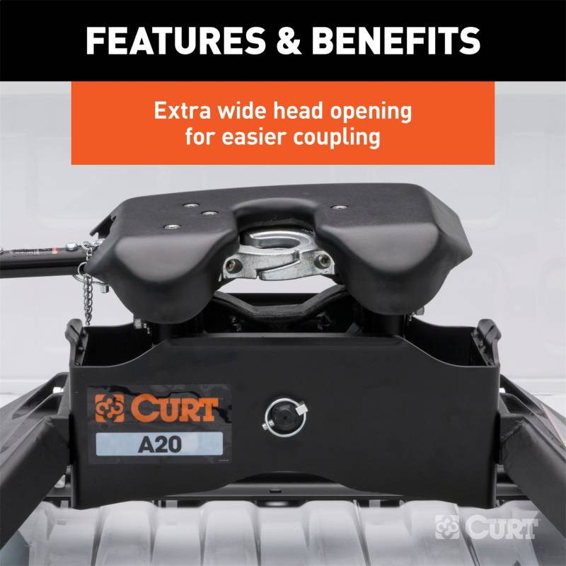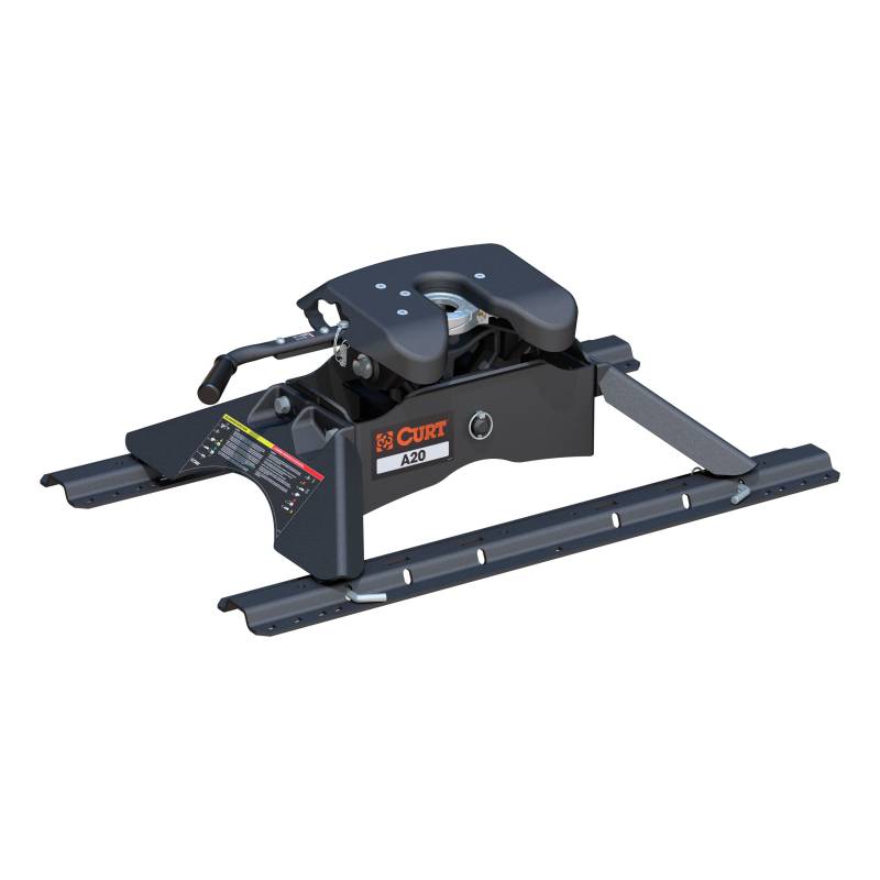 A20 5th Wheel Hitch with Rails The CURT A20 5th wheel hitch offers smoother, quieter towing for your home-away-from-home, combining the patented technology of our A-series, an easier mounting system and the power of a 20K 5th wheel hitch. Like our A16 hitch, this 20K 5th wheel hitch uses a patented cast yoke to allow for unimpeded head movement, while providing exceptional stability for the trailer. The yoke has a set of poly-torsion inserts to suppress shock loads and reduce excessive noise, and the head features high-strength, interlocking jaws to give the trailer stability and the freedom to pivot and swivel as needed. The A20 5th wheel hitch is also engineered for easier installation. The legs are equipped with two pins to properly align with the mounting holes, and they have easy-access mounting bolts for ergonomic tightening. The 5th wheel head also has a fast, one-pin removal system to make installation and removal from the truck bed easier. This 20K 5th wheel includes a set of industry-standard 5th wheel rails to mount onto custom 5th wheel brackets (brackets sold separately). Once installed, the A20 is fast and simple to operate. It features an extra-wide head opening to increase the coupling area for the trailer, and it has a lockable, single-throw handle that self-resets to the ready-to-couple position after uncoupling. To make coupling even easier, it is equipped with a coupling indicator that is visible from the truck cab. The indicator shows the status of the connection and eliminates the need for you to check multiple times while coupling. To protect the A20 5th wheel hitch against rust, wear and whatever other threats might impede your cross-country tour, it comes with a black carbide powder coat finish and a limited lifetime warranty. We also test the A20 for safety in accordance with SAE J2638 to ensure reliability for the road ahead.