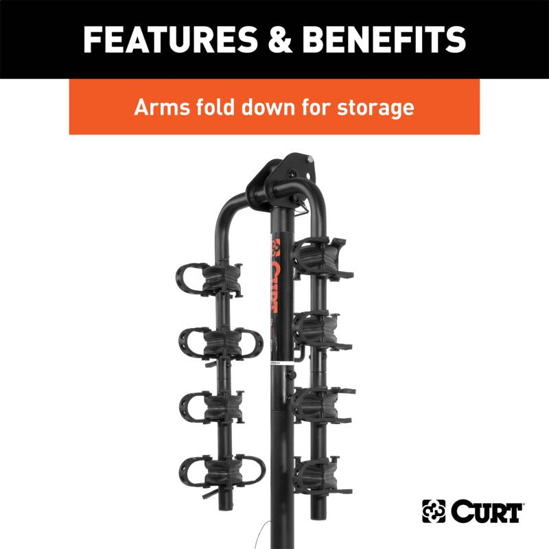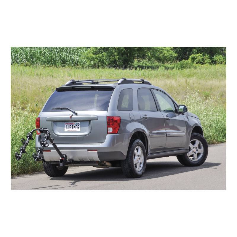Whether you are an avid mountain biker or a casual rider, you will want CURT along for the ride. CURT bike racks offer both versatility and quality and are available in several different styles to fit your needs. CURT standard hitch-mounted bike racks are anything but average. They feature an adjustable shank to fit either a 1-1/4 in. or 2 in. receiver and allow use on most trailer hitch classes. Our standard bike racks also come with several useful features, including an anti-wobble shank to reduce noise and keep bikes more secure, and a compact design for easy storage. They feature adjustable arms to accommodate various bike heights and styles, and the arms can be folded down, when not in use, to remain out of the way. The tilt-down design built into our standard bike racks allows you easier access to the rear of your vehicle whenever necessary. This particular CURT standard bike rack has an extendable design, allowing it to be used as a 2-bike model or 4-bike model. It features a maximum load limit of 90 lbs. or 180 lbs., depending on the configuration. To protect it against the elements and the trail ahead, this bike rack comes with a durable black powder coat finish.