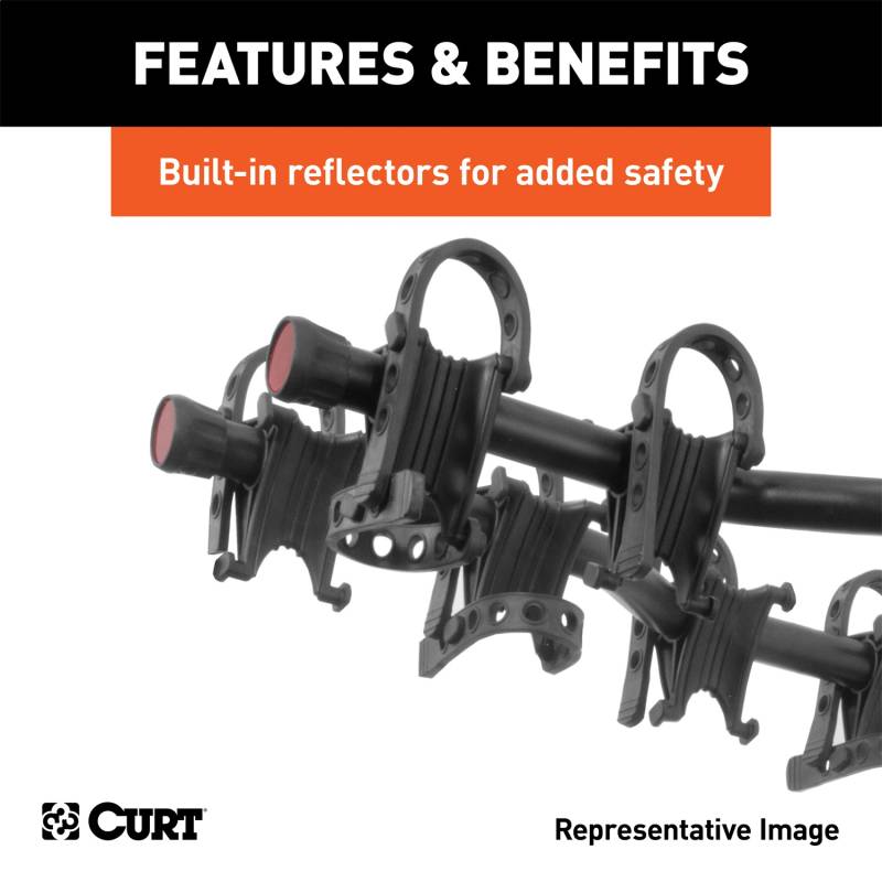 Whether you are an avid mountain biker or a casual rider, you will want CURT along for the ride. CURT bike racks offer both versatility and quality and are available in several different styles to fit your needs. CURT premium bike racks come with an anti-wobble shank for better bike security, foldable arms for a compact design and a tilt-away feature for easy rear vehicle access. One feature that sets the premium bike rack apart from others is its tapered arm design. CURT premium bike racks are very accommodating to different types of bikes, having tapered arms to fit a range of bike sizes. This makes them an especially attractive option for families with younger children. All CURT premium bike rack comes with a durable powder coat finish, built-in reflectors and non-scratch rubber cradles. This model features a maximum load limit of 225 lbs. and is able to hold up to five bikes at a time. NOTE: For use with any frame-mounted 2 in. class 3 or higher trailer hitch receiver. Clamp-on bumper receivers and traditional 4 in. square bumpers should not be used to mount bike racks. Do not exceed receiver weight limits.