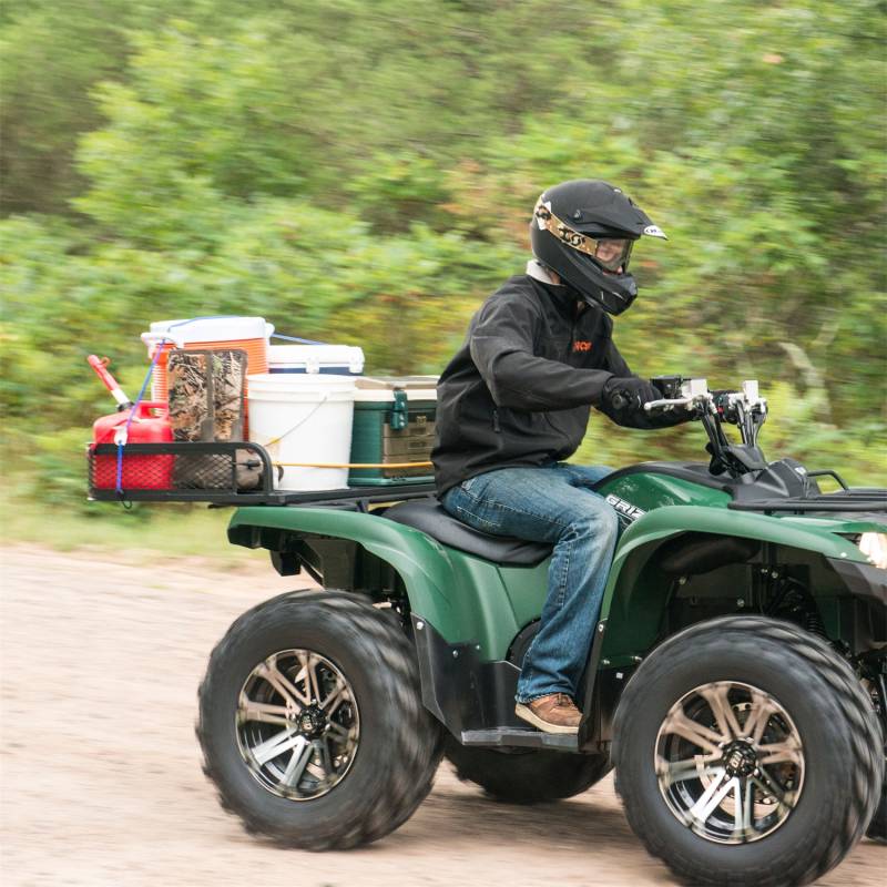 41" x 26" Black Steel Universal ATV Cargo Carrier There is nothing like the sense of freedom and adventure that comes with an ATV. Spinning through the mud, navigating a forest trail or simply driving back to your deer stand -- wherever you love to ride, you know the thrill of ATVing. CURT ATV towing products allow you to maximize your ATV experience by giving you functional equipment that is built to last. The CURT universal ATV cargo carrier is designed to mount on the back of your ATV and provide a generous and more secure space for your cargo. It measures 41" x 26", giving you seven and a half square feet of storage area for hauling camping supplies, game, tools or whatever you need to transport with your ATV. The CURT ATV cargo carrier also features 6-1/4" high sides to keep items more secure over rough terrain. It features a strong mesh construction and comes with mounting hardware for easy installation. Whatever your all-terrain vehicle of choice -- quad, quad bike, three wheeler or four wheeler -- give yourself the advantage with CURT ATV towing products.