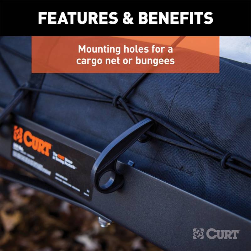 60" x 20" Black Steel Tray Cargo Carrier (Folding 2" Shank, 500 lbs.) Even with the roomiest of vehicles, packing the car for a long trip can quickly turn into a frustrating game of Tetris. CURT cargo carriers are a simple yet effective solution for maximizing the storage area of your vehicle. The advantage of a hitch-mounted cargo carrier is that it can be mounted on the rear or front end of a vehicle as long as the vehicle is properly equipped with the right receiver hitch. Mounting a cargo carrier in the front opens up the rear receiver hitch for towing a trailer or adding a second carrier or bike rack if needed. The hitch-mounted design also makes installation quick and easy. CURT introduces the mesh, bolt-together, tray-style cargo carrier. This carrier features heavy-duty steel construction and a durable black carbide powder coat finish to resist rust and corrosion from outdoor exposure. It comes with a 2" x 2" shank and can hold up to 500 lbs. of cargo. This particular model also comes with a folding shank to allow the cargo carrier to be folded up when not in use, and it features a simple two-piece design for quick assembly. It offers a total storage area of 60" x 20". CURT tray-style cargo carriers are versatile and simple to use. They have holes along the outer edge for mounting a cargo net or bungees, making it easy to keep items secure, and they provide plenty of space to make your trip more comfortable, no matter where you are headed. Whether you prefer the hitch-mounted carrier or the roof rack option, CURT has cargo management solutions to meet your needs.