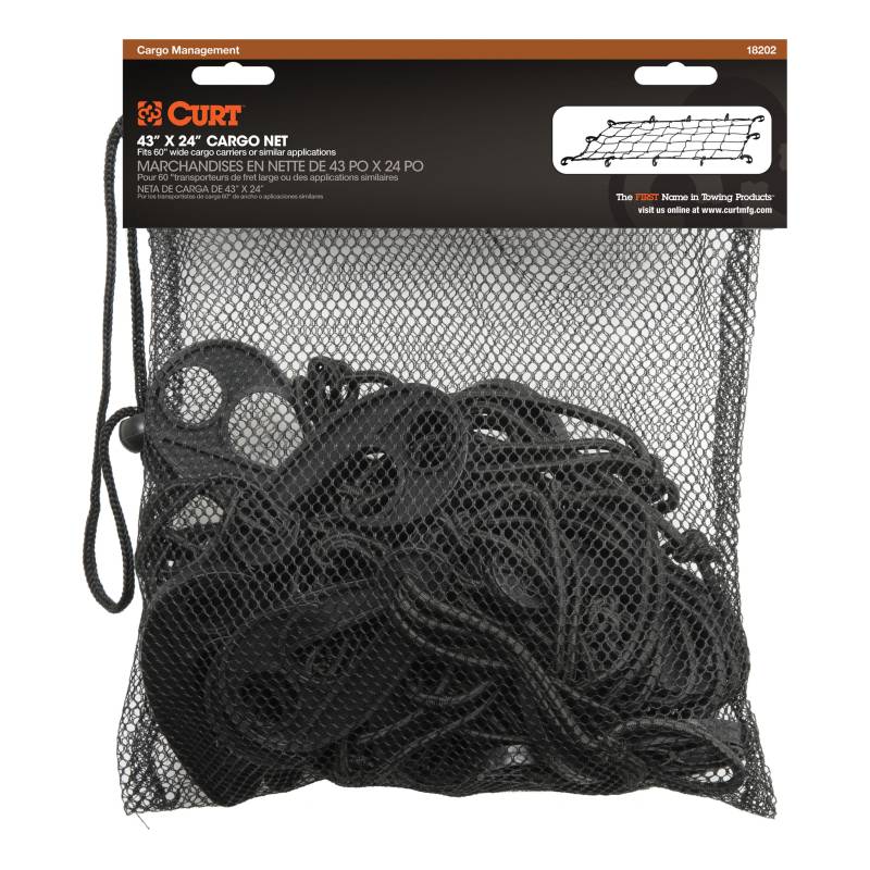 43" x 24" Elastic Cargo Net for Hitch Carrier Even with the roomiest of vehicles, packing the car for a long trip can quickly turn into a frustrating game of Tetris. CURT cargo carriers are a simple yet effective solution for maximizing the storage area of your vehicle. CURT cargo carrier nets are the simple, effective way to secure your cargo. Using a series of ropes or bungees to keep your cargo in place isn't always effective. Ropes can be a nuisance to unravel and remove from your trailer, while bungees can be unreliable. CURT cargo carrier nets combine the convenience of a bungee cord with the effectiveness of a rope. Our cargo nets feature a series of hooks that latch onto your cargo carrier and provide a taut netting across your items. This cargo net measures 43" x 24" and is able to fit cargo carriers up to 60" wide. Whether you prefer the hitch-mounted carrier or the roof rack option, CURT has cargo management solutions to meet your needs.