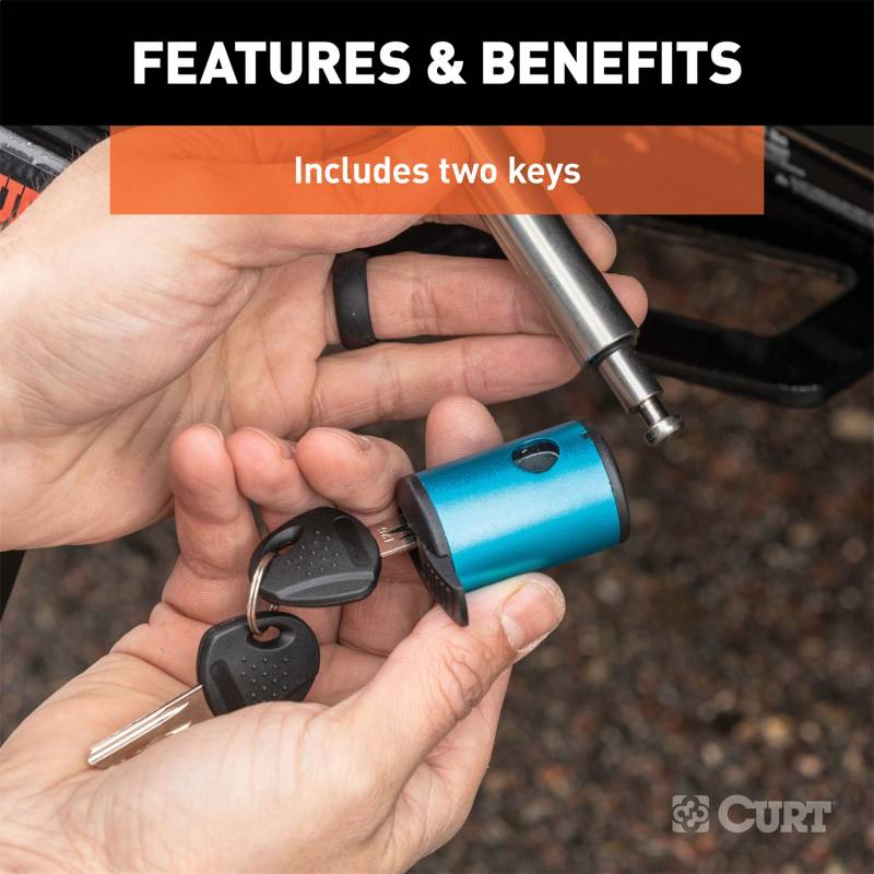 Make your tow vehicle and trailer more secure by keeping them locked up tight with a CURT hitch lock. Like a hitch pin and clip, a hitch lock is designed to insert into the fastener hole in the side of a receiver tube in order to hold a ball mount or hitch-mounted accessory in place. While a CURT hitch pin does offer sufficient strength for keeping your ball mount firmly attached, a CURT hitch lock goes one step further. CURT hitch locks allow you to lock your ball mount into your trailer hitch, deterring theft and preventing anyone from detaching your trailer at the ball mount and towing away your property without your permission. This CURT hitch lock features a right angle, barbell design and comes with a 5/8 in. pin diameter to fit a 2 in. receiver tube size. CURT barbell hitch locks are comprised of a pin with two end caps and a round locking mechanism. They are key-operated and activate with a simple 1/4-turn. They also come with a watertight dust cap to keep out the elements and prevent corrosion. For the ultimate in towing security, a hitch lock and coupler lock used together will provide security at both the vehicle-side and trailer-side of your towing setup. For your boat, ATV or camper, keep your toys more secure with CURT hitch locks.