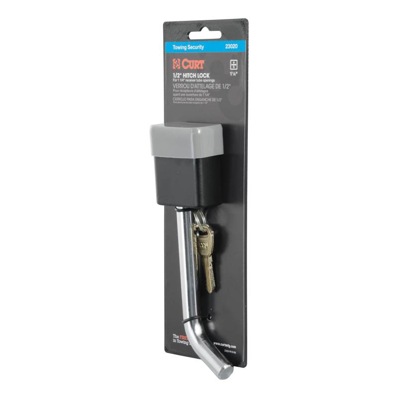 1/2" Hitch Lock (1-1/4" Receiver, Deadbolt, Chrome) Make your tow vehicle and trailer more secure by keeping them locked up tight with a CURT hitch lock. Like a hitch pin and clip, a hitch lock is designed to insert into the fastener hole in the side of a receiver tube in order to hold a ball mount or hitch-mounted accessory in place. While a CURT hitch pin does offer sufficient strength for keeping your ball mount firmly attached, a CURT hitch lock goes one step further. CURT hitch locks allow you to lock your ball mount into your trailer hitch, deterring theft and preventing anyone from detaching your trailer at the ball mount and towing away your property without your permission. This CURT hitch lock features a deadbolt design and comes with a 1/2" pin diameter to fit a 1-1/4" receiver tube size. CURT deadbolt hitch locks have a solid, square-shaped lock mechanism and a bent handle for easier gripping. They are key-operated and activate with a simple 1/4-turn. They also come with a watertight dust cap to keep out the elements and prevent corrosion. For the ultimate in towing security, a hitch lock and coupler lock used together will provide security at both the vehicle-side and trailer-side of your towing setup. For your boat, ATV or camper, keep your toys more secure with CURT hitch locks.