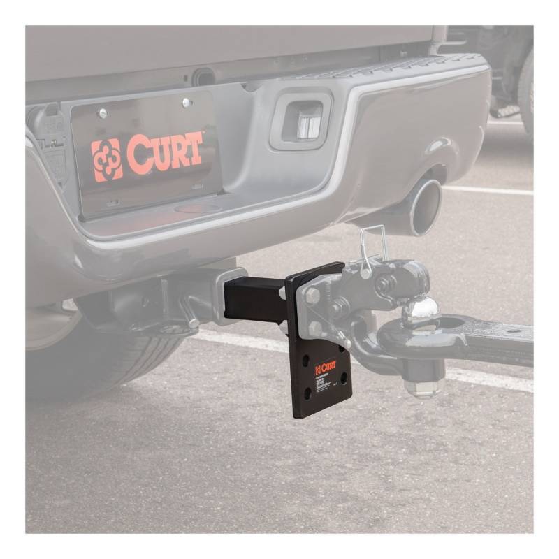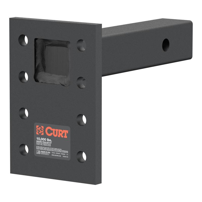 Adjustable Pintle Mount (2" Shank, 10,000 lbs., 7" High, 8" Long) In agriculture, construction and even military applications, pintle hitches are the trusted product of specialized towing. They are notorious for their high weight capacity and simple design. The basic pintle hitch is essentially a hook and loop, with the hook attached to the vehicle and the loop mounted on the trailer. Because of their simple design, pintle hitches are able to have thicker metal construction and more secure coupling. CURT has a wide variety of pintle hitches and pintle-style products to give you a complete solution for your heavy-duty towing needs. This adjustable pintle mount is designed to accept a bolt-on pintle hook or combination ball and pintle. It features a series of mounting holes to provide three different mounting heights for the hook and can be mounted in any 2" x 2" receiver tube opening. This pintle mount offers a gross trailer weight capacity up to 10,000 lbs. and features a total plate height of 7", providing up to 6-1/2" of drop (NOTE: Not for use in rise position; never exceed the lowest weight capacity of any towing component; i.e. the vehicle, hitch, trailer, etc). The heavyweight towing done with pintle hitches implies a certain amount of wear and tear on your towing equipment, and to prepare for this, CURT uses a quality finish on all our pintle mounts, lunette eyes and combination pintle hitches. This pintle mount is coated in a tough black carbide powder coat finish to provide the perfect amount of rust and scratch resistance needed to face the heavy-duty towing you do every day.