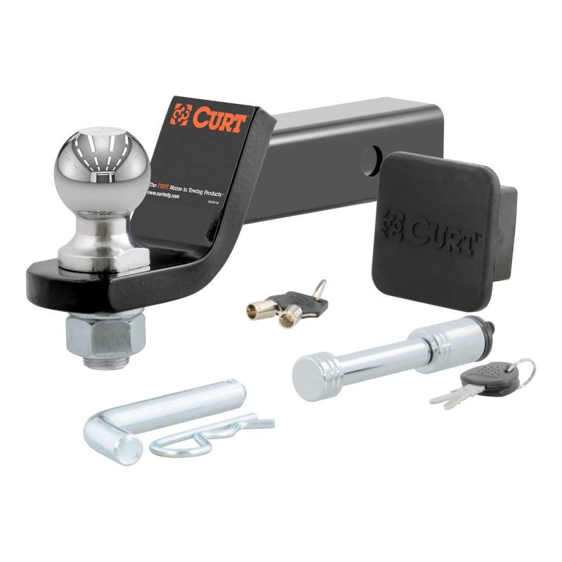 The towing starter kit by CURT Manufacturing is the most convenient way to get set up with the basic towing gear you will need for a brand new trailer hitch. The starter kit eliminates the need for you to make multiple purchases and to try to figure out if you are buying the right products to fit your existing equipment. The CURT towing starter kit includes a ball mount, trailer ball, hitch pin and clip, hitch lock and a rubber receiver tube cover. It has everything you need to get your trailer coupled to your receiver hitch. This kit features a ball mount with a gross trailer weight capacity of 7,500 lbs. and a tongue weight capacity of 750 lbs. It measures 8-1/4 in. long, has 2 in. of drop and 3/4 in. of rise. CURT ball mounts are CNC-formed and robotically welded to be an exact fit for your towing application. They are built with quality steel for strength and coated with a high-gloss black powder coat finish for durable corrosion and scratch resistance.