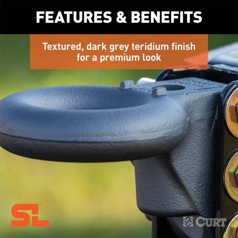 SecureLatch Channel-Style Lunette Ring (40,000 lbs., 3" ID) The CURT SecureLatch lunette ring offers enhanced security and maximum versatility. Its integrated locking pin helps prevent coupling and theft when your trailer is left unattended, featuring holes in the bottom to accept a padlock. The pin can also be turned 90 degrees to allow you to hitch up your trailer. This lunette ring also offers flexible height adjustment. It can be moved up or down for more drop or rise as needed. The CURT SecureLatch lunette ring is intended to fit an 11-3/4-inch x 2-3/4-inch inside width channel (sold separately). It has a three-hole bolt pattern. The lunette ring itself has a 3-inch inside diameter to couple to a pintle hook or ball and pintle combination, and it is rated for up to 40,000 pounds gross trailer weight. This SecureLatch lunette eyelet is made from austempered iron for superior strength and wear resistance, and it features a durable, dark grey teridium powder coat finish for resistance to the elements. Drop-in pin accepts lock to deter theft (turns 90 degrees while coupled) Vertically offset base allows ring to be flipped for maximum height adjustment Heavy-duty 3-hole bolt pattern fits 11-3/4" x 2-3/4" channel only (#48651) Rated for 40,000 lbs. gross trailer weight 3" inside diameter fits pintle hooks, ball & pintle combinations or clevis bars