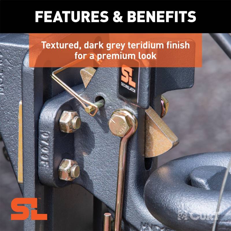 SecureLatch Pintle Hook (30,000 lbs, 2-1/2" or 3" Lunette) Enjoy automatic trailer coupling with the unique auto-locking mechanism of this SecureLatch pintle hook. Just back up to the trailer tongue -- the integrated striker plate helps stop and center the lunette ring. Drop the ring onto the hook, and the SecureLatch mechanism automatically engages the primary lock. Just insert the secondary safety pin and you're ready to tow. This unique pintle hook also has a cupped design to hold the lunette eyelet more tightly and deter chucking noises. This pintle hook is rated for 30,000 pounds gross trailer weight and is constructed from austempered cast iron for superior strength and wear resistance. It fits 2-1/2-inch or 3-inch lunette rings. NOTE: SecureLatch slotted pintle mount required for installation (pintle mount and bolts sold separately). Auto-locking system secures primary latch without manual coupling required Cupped hook tightly holds lunette ring fore and aft to reduce chucking and noise Built-in back plate helps position lunette ring for easier hookup Fits SecureLatch pintle mounts with slotted plate (sold separately) Quick, easy, one-tool height adjustments -- no disassembly required