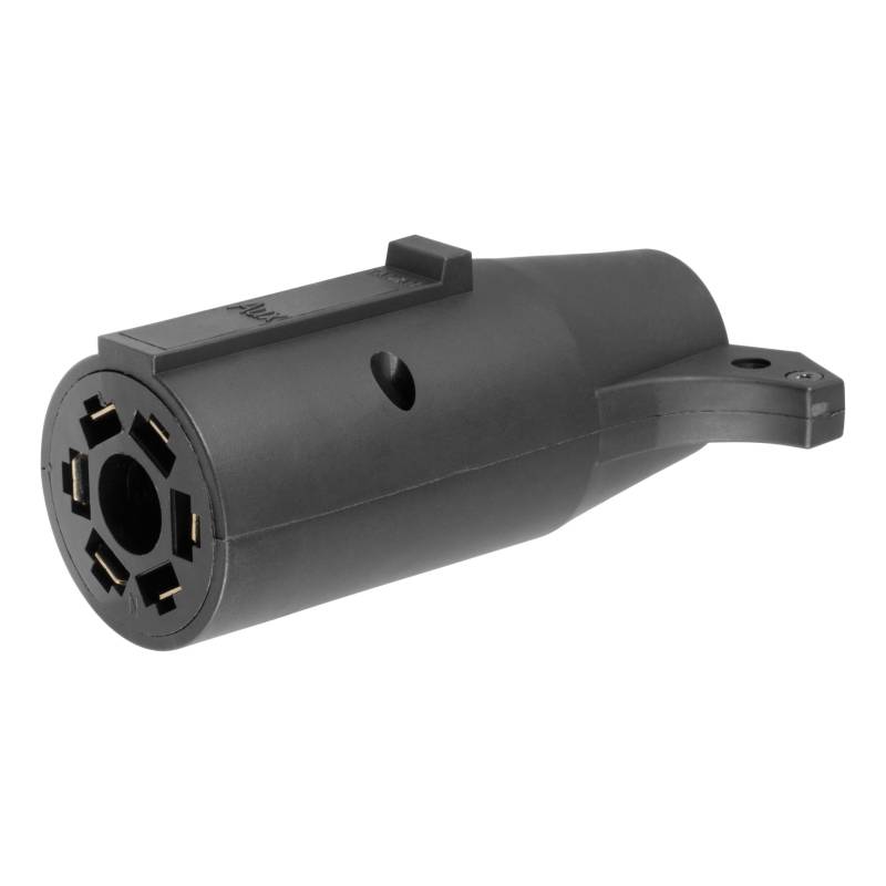 There are several different types of connectors used to supply power from a tow vehicles electrical system to a trailers wiring system. Some trailers only need the bare essentials -- running lights, brake lights and turn signals -- while others require a connection for reverse lights, electric brakes and auxiliary power. With connectors ranging from simple to complex, it may be the case that the connection between your vehicle and your trailer is not a perfect match. For example, your truck may be equipped with a 6-way round socket, but your trailer may have a 4-way flat plug. For this very common problem, CURT offers a quick and simple solution in the form of an electrical adapter. An adapter is an electrical device that allows a connection to be made between a mismatched trailer plug and vehicle socket. It easily plugs in your vehicles electrical socket and usually requires no additional wiring. CURT offers an array of adapters to accommodate most types of plugs and sockets, including 4-way flat, 4-way round, 5-way flat, 6-way round, 7-way RV blades and more. This electrical adapter is designed to adapt a 7-way RV blade vehicle socket to fit a 6-way round trailer plug (center pin for auxiliary power). It features quality plastic construction and requires no splicing. All CURT wiring and electrical products come with a one-year limited warranty to give you the assurance you need to tow with confidence.