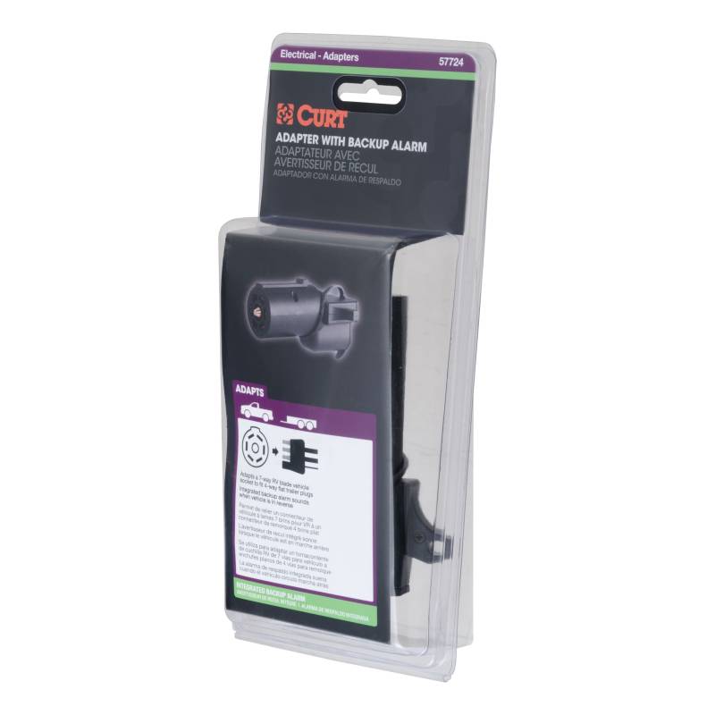 There are several different types of connectors used to supply power from a tow vehicles electrical system to a trailers wiring system. Some trailers only need the bare essentials -- running lights, brake lights and turn signals -- while others require a connection for reverse lights, electric brakes and auxiliary power. With connectors ranging from simple to complex, it may be the case that the connection between your vehicle and your trailer is not a perfect match. For example, your truck may be equipped with a 6-way round socket, but your trailer may have a 4-way flat plug. For this very common problem, CURT offers a quick and simple solution in the form of an electrical adapter. An adapter is an electrical device that allows a connection to be made between a mismatched trailer plug and vehicle socket. It easily plugs in your vehicles electrical socket and usually requires no additional wiring. CURT offers an array of adapters to accommodate most types of plugs and sockets, including 4-way flat, 4-way round, 5-way flat, 6-way round, 7-way RV blades and more. This electrical adapter is actually designed to adapt a 7-way RV blade to a 4-way flat vehicle socket. It comes with its own backup alarm to send out an audible signal when your vehicle is in reverse and a dust cover to protect from dirt, water and road grime. All CURT wiring and electrical products come with a one-year limited warranty to give you the assurance you need to tow with confidence.