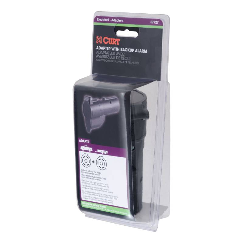There are several different types of connectors used to supply power from a tow vehicles electrical system to a trailers wiring system. Some trailers only need the bare essentials -- running lights, brake lights and turn signals -- while others require a connection for reverse lights, electric brakes and auxiliary power. With connectors ranging from simple to complex, it may be the case that the connection between your vehicle and your trailer is not a perfect match. For example, your truck may be equipped with a 6-way round socket, but your trailer may have a 4-way flat plug. For this very common problem, CURT offers a quick and simple solution in the form of an electrical adapter. An adapter is an electrical device that allows a connection to be made between a mismatched trailer plug and vehicle socket. It easily plugs in your vehicles electrical socket and usually requires no additional wiring. CURT offers an array of adapters to accommodate most types of plugs and sockets, including 4-way flat, 4-way round, 5-way flat, 6-way round, 7-way RV blades and more. This electrical adapter plugs into a 7-way RV blade vehicle socket and equips your tow vehicle with its own backup alarm to send out an audible signal when your vehicle is in reverse. It also features a dust cover to protect from dirt, water and road grime. All CURT wiring and electrical products come with a one-year limited warranty to give you the assurance you need to tow with confidence.