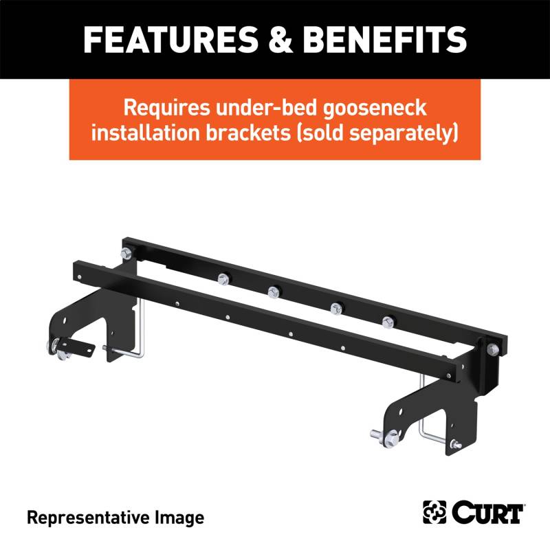 A CURT gooseneck hitch is more than a necessary tool for towing; it is an integrated extension of your truck that allows you turn your 4x4 into the workhorse it was designed to be. Gooseneck hitches are stronger, tougher and more subtle than any other, and when quality craftsmanship and intelligent design become the fuel that drives a gooseneck hitch, you get a towing solution that leaves others lost for words. Designed to be the fastest gooseneck hitch on the market, the CURT Quick Goose II gooseneck hitch features two handles for operating the trailer ball. One handle is made for raising and lowering the trailer ball and the other for locking it into place, eliminating the need for you to climb in and out of the truck bed when hitching up. Like the Double Lock gooseneck hitch, the Quick Goose II allows for full use of the truck bed with its droppable trailer ball and spring-loaded safety chain hookups. The Quick Goose II comes with heavy-duty handles, a chrome trim ring, a black carbide powder coat finish and a limited lifetime warranty. It can tow up to 30,000 lbs. of gross trailer weight and 7,500 lbs. of tongue weight. This particular Quick Goose II gooseneck hitch is designed to be a custom fit for certain models of Dodge Ram and Ford (for a complete listing of vehicle and installation bracket compatibility).