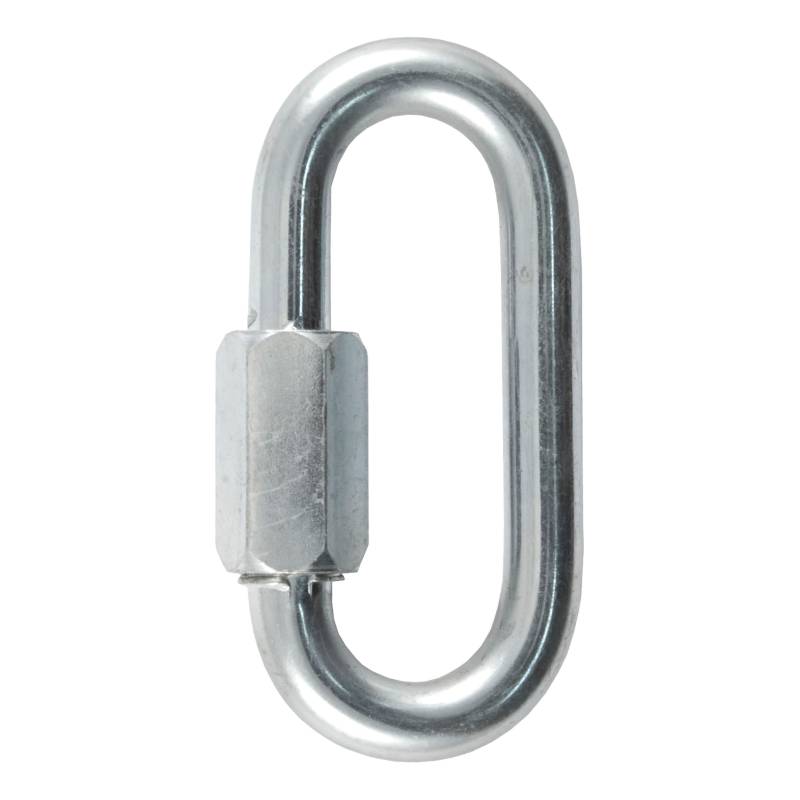 CURT quick links are an extremely versatile and reliable tool to help you get to your destination and go a little further once you get there. A quick link is essentially a hook that is able to be fastened into a closed loop. This means it can be linked onto any D-ring or tie-down like a hook and just as easily secured like a seamless link in a chain. CURT quick links feature a special threaded end and barrel screw that allow them to be dependable and convenient. The threaded link requires no tools for tightening or loosening, though it does feature a hex shape that can accept a wrench for an extra tight hold. Quick link hooks can be used to connect rope, cable and chain, and they are the perfect safety accessory to maximize the security of your safety chains and trailer. Their list of possible applications also goes well beyond towing, giving you a reliable connection for rock climbing, boating, camping, setting up a swing or hammock, leashing the dog, repairing chain, fastening down cargo and more. To make sure our quick links are fit to face the outdoors and all of your undertakings, we construct them from heat-treated steel and give them a zinc-plated finish for durability and rust resistance. This CURT quick link features a breaking strength of 11,000 lbs., a working load limit of 2,200 lbs. and features a 3/8 in. diameter link.
