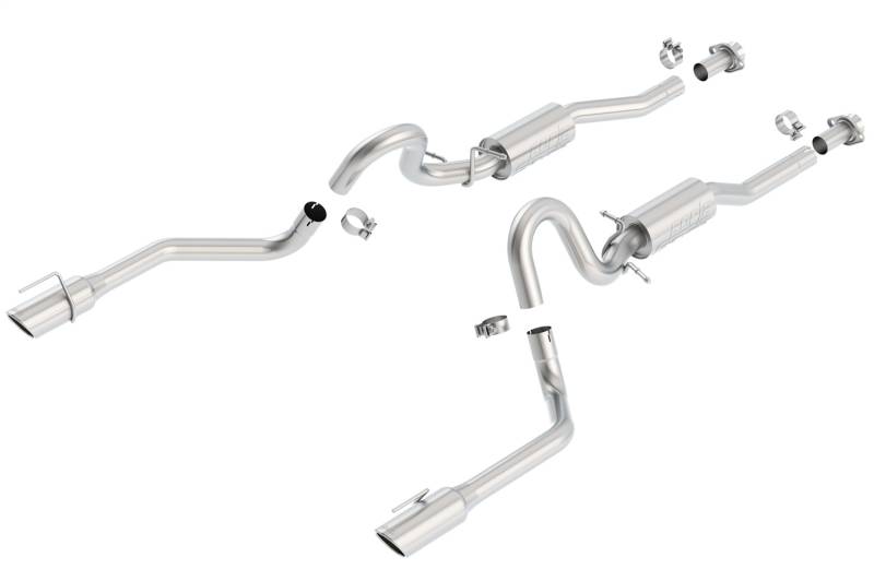 Cat-Back Exhaust System - S-Type For 4 decades, Borla Exhaust has been the choice of Mustang experts, from the Cobra-R SVT Mustang to the Ford GT. Major players in the racing industry and leading tuners from Roush, Steeda, Saleen and Ford Racing to the Shelby 427 Cobra have relied on Borla . Borla experience and advance engineering produced the sexy "S- Type" exhaust with outstanding flow numbers that generates great power enhancements. These attributes, coupled with an aggressive sound of power and awesome big bright chrome on T-304 stainless steel tips, proclaim this Stang is all business. Airflow management and exhaust engineering is a science with which Borla has more experience than anyone in the exhaust aftermarket. The performance matches the famous Borla systems of the past but with a unique muffler and exhaust configuration canceling additional high frequency sound waves delivering a significant increase in CFM from the factory system which, as most engine builders will confirm, accounts for the dramatic power improvements. Perhaps more importantly, this added flow maximizes performance for other aftermarket enhancements installed on the Mustang because all Borla exhaust products are tuned for maximum output from any aftermarket performance upgrade. Borla the original pioneers of aerospace-grade T-304 stainless steel (superior to 409 or aluminized steel) free-flow exhaust utilizes patented award and race winning technology to deliver quality, sound, performance gains and enhanced fuel economy all with an easy bolt-on installation. Unsurpassed written Million-Mile Warranty.