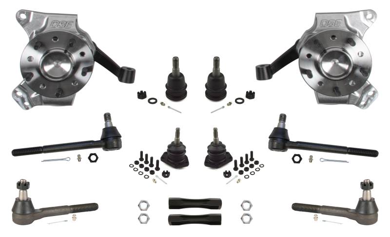 Detroit Speed - Front Drop Spindle Kit The Detroit Speed Drop Spindle Kit improves the handling and performance of your 1967-1970 Chevrolet/GMC C10/C15 Truck while lowering the front ride height by 2.50-inch The drop spindle kit includes forged aluminum drop spindles with forged steel steering arms, ball joints, tie-rod ends, and tie-rod adjusters. The uprights feature truck hub pack wheel bearings with a dual bolt pattern (5x5-inch or 5x4.75-inch). The hub bearings use OE-style GMT800 (1999-2006) Silverado brake design, allowing stock or aftermarket brake options. Lower Your 1967-1970 Chevrolet/GMC C10/C15 2.50-inch with Forged Aluminum Drop Spindles with Forged Steel Steering Arms 100% Bolt-On for a Quick and Easy Installation in Your Garage Modern GMT800 (1999-2006 Silverado) Truck Hub Pack, Wheel Bearings with Dual Bolt Pattern (5x5-inch or 5x4.75-inch), Means No More Packing Messy Wheel Bearings Made in the USA, DSE Forged Aluminum Spindles with Forged Steel Steering Arms – for Strength and Durability Designed to Use the GMT800 Brake Calipers, Brackets, and Pads (requires DSE 13-inch dual drilled rotors) – Also Allows Aftermarket Brake Options