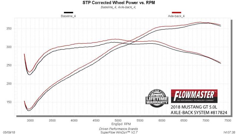This Flowmaster® Outlaw Axle-back exhaust system is specifically designed for the 2018-2023 Ford Mustang GT with the 5.0L engine and Factory Active Performance Exhaust Option. System features include a pair of our race-proven Outlaw® Series mufflers for a very aggressive exterior sound level with a noticeable interior tone and large 3.00-inch mandrel-bent 409S stainless steel tubing for high flow, durability, and longevity. Add to that, a pair of our high-quality valves to accommodate the factory exhaust actuators for when you really want to open up the sound. The system is finished off with quad 4.00-inch black ceramic coated 304 stainless steel tips for an aggressive look that demands attention, the same as the exhaust note from the Outlaw Series mufflers. Includes all necessary parts, hardware and detailed instructions for an easy installation you can do at home. Covered by our Lifetime Limited Warranty. Note: Fits both coupes and convertibles.