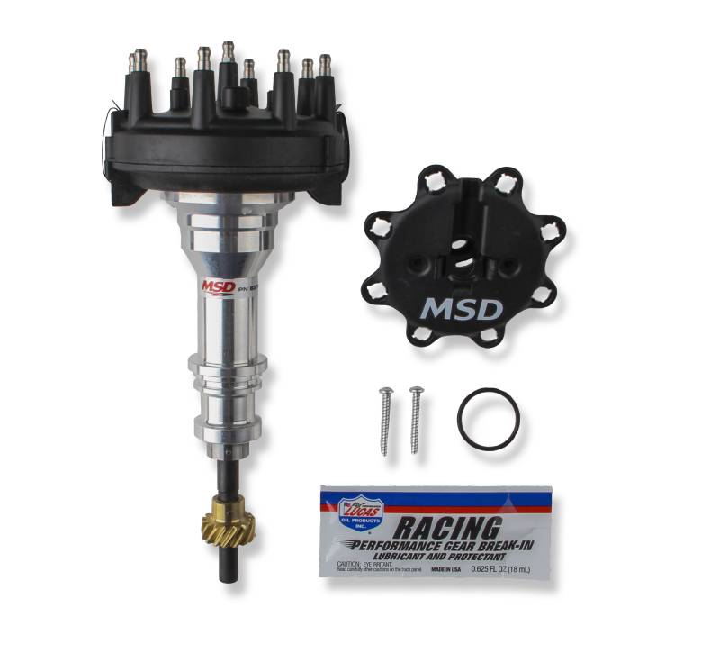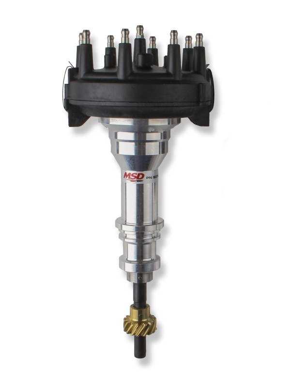 These distributors have a low-profile cap assembly to clear busy intake set-ups and are topped with MSD's new Rynite-molded Ford-style cap and wire retainer. The low design is accomplished because the only thing under the cap is a rotor! These distributors don't have an advance assembly or pick-up so they must be used with a Crank Trigger. Since these distributors are designed for racing applications, a ball bearing is pressed into the housing to guide the polished steel shaft. Each distributor is supplied with a bronze gear.\nBlue oval racers will be happy to see these Crank Trigger Distributors. The housing of these three distributors are standard-height Ford Distributors so they will work with cast intake manifolds.