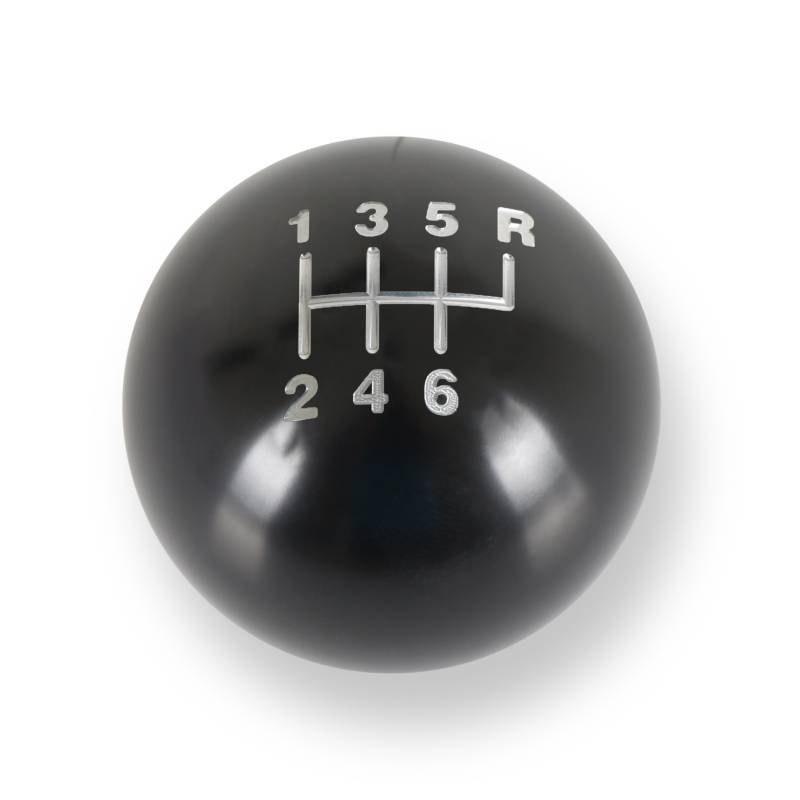 Hurst anodized gloss black billet shift knob with a 6-speed pattern engraved. This shift knob has a 2-inch diameter, an M16 x 1.5 thread size, and includes adapters for 3/8-16 and 3/8-24 as well as jam nuts. Similar shift knobs are available in various colors, billet or ABS, and blank or engraved 4, 5, or 6-speed shift patterns.