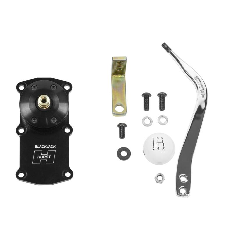 This Hurst® Blackjack™ Shifter is specifically designed to locate the shifter handle in the proper location for all 1964-1967 Chevrolet Chevelle applications when using a Tremec TKO 500/600 or TR3550 5-speed transmission. Hurst Blackjack shifter housings are CNC machined from billet 6061 aluminum, feature a tough black MIL-Spec anodized finish with the Hurst logo CNC machined in the top plate, ensuring you're buying the highest quality shifter available today for your Tremec TKO transmission. Other features include a zinc-plated hardened chromoly steel stick adapter, dual stick centering springs, hardened chromoly pivot pins and a durable delrin pivot ball for positive, quiet operation. Includes the classic Hurst chrome flat bar stick and white shift ball for the specified application. Fits with/without factory center console. Be sure to check out our new Hurst Billet Aluminum shift sticks.