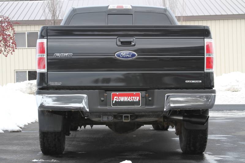 Introducing the Flow FX Cat-back exhaust system for the 2009-2014 Ford F-150 with 3.5L Ecoboost, 4.6L, 5.0L and 5.4L engines. This stainless steel performance single exhaust system bolts up to the factory catalytic converter flange with a large 3-inch mandrel-bent tubing flowing into the "straight-through" Flow FX performance muffler. The Flow FX muffler creates a deep powerful sound outside the vehicle with a moderate tone inside the cab. The mandrel-bent tailpipe exits behind the passenger side rear tire and is finished off with a large 4.50-inch black ceramic coated exhaust tip embossed with the Flowmaster name. The system utilizes the factory hanger locations and connections and includes all necessary parts, hardware and detailed instructions for an easy at home installation. Note: Fits 2/4 wheel drive and all wheelbases.