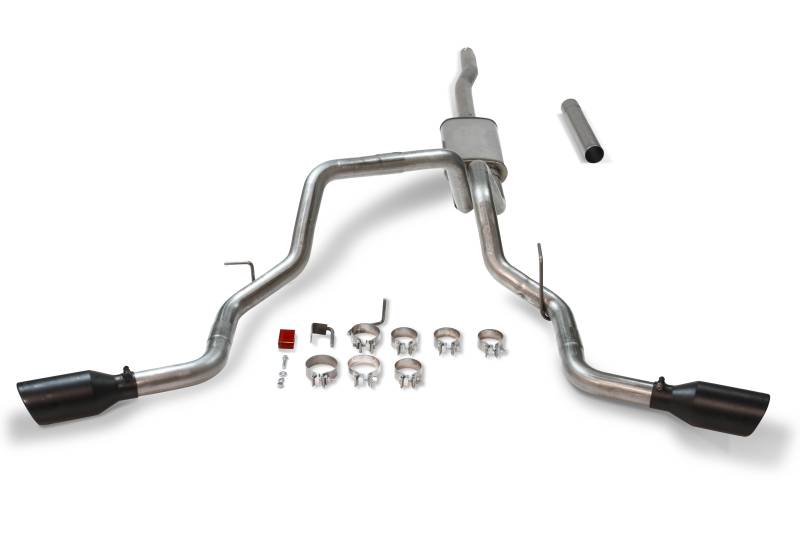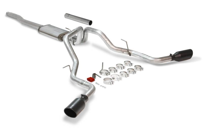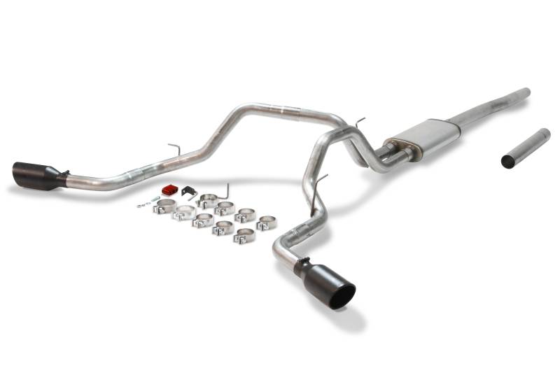 The Flowmaster® Flow FX Cat-back exhaust system is designed for 2004-2008 Ford F-150 trucks with 4.6L and 5.4L engines. This bolt-on system is manufactured using durable 409 stainless steel throughout, and features a 3.00-inch inlet pipe leading to a single inlet/dual outlet Flow FX® straight-through muffler for a deep, moderately aggressive sound and maximum performance. The dual 2.50-inch mandrel-bent tailpipes are custom routed to clear the factory spare tire and tow hitch without any clearance issues and exit out the sides behind the rear tires, which is ideal when towing so you don't blow exhaust fumes on your boat, vehicle or trailer. The system is then finished off with a pair of large 4.50-inch black ceramic coated stainless steel tips, giving your F-150 an aggressive look to go with the sound of the Flow FX performance muffler. This system utilizes the factory hanger locations and includes detailed instructions and all necessary hardware for an easy at home installation. Notes: Fits all 2/4 wheel drive models and all wheelbases.