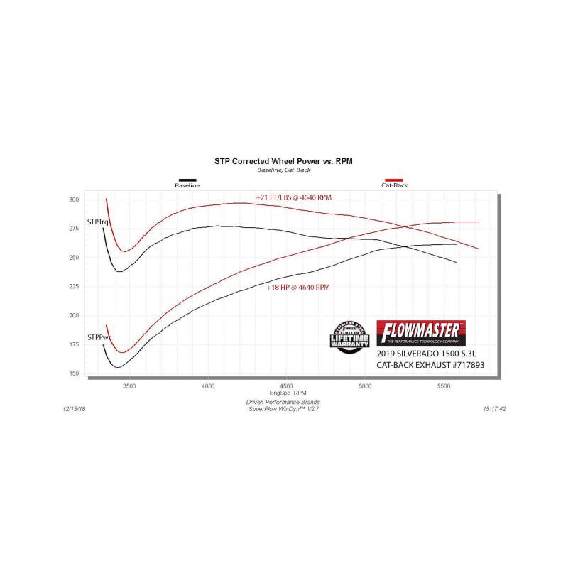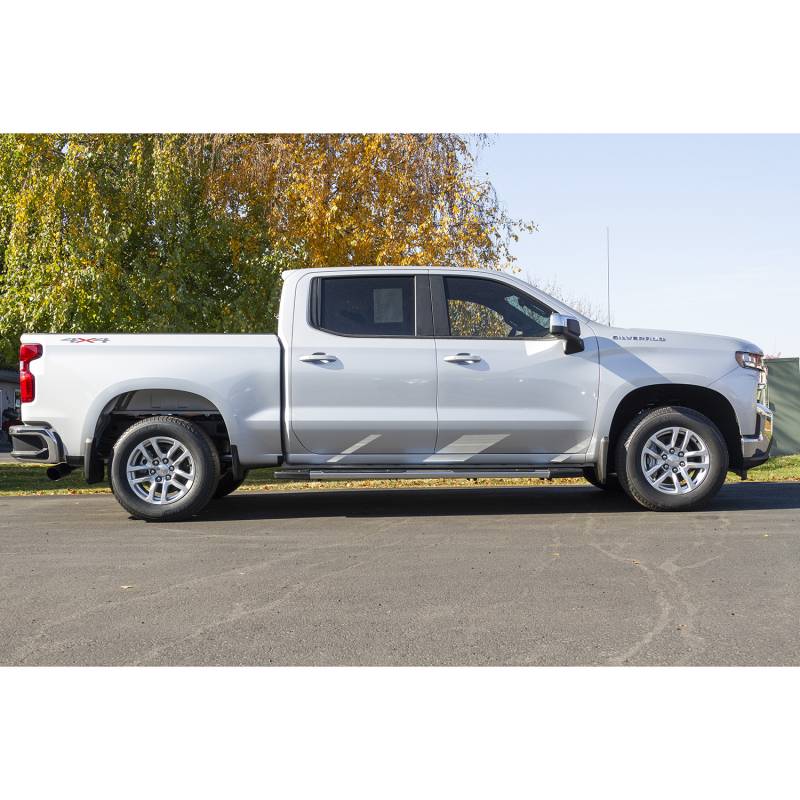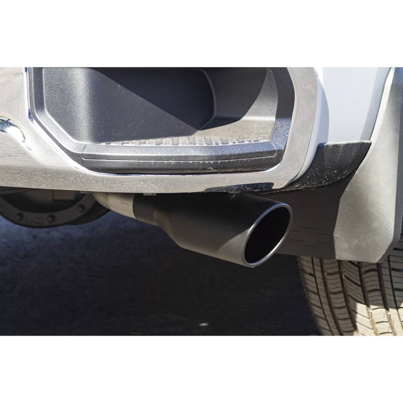 This Flowmaster® Flow FX® cat-back exhaust system for the 2019-2026 Chevrolet Silverado/GMC Sierra 1500 Crew Cab and Double Cab models with the 5.3-liter engine is manufactured using durable 409 stainless steel throughout and features a 3.00-inch inlet pipe leading to a single inlet/dual outlet Flow FX "straight-through" muffler for great sound and maximum performance. The dual 2.50-inch mandrel bent tailpipes exit out the side at an angle behind the rear wheels directing exhaust away from your boat or travel trailer when towing. Maximum dyno gains of 18 hp and 21 lb.ft at the rear wheels. The system is finished off with a pair of large 4.50-inch diameter black ceramic coated 304S stainless steel tips, giving your truck a custom look that goes hand in hand with that deep performance Flow FX sound. The system uses all the existing factory hanger locations and includes an additional hanger to install the new left side tailpipe. Includes installation instructions and all necessary hardware for an easy installation that you can do at home. Note: Fits 2wd and 4wd models.