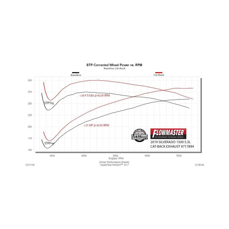This Flowmaster® Flow FX™ Cat-back exhaust system is designed for the 2019*-2026 GM Silverado/Sierra 1500 trucks (*new body style) with 5.3L engine and factory dual exhaust. This bolt-on system is manufactured using durable 409 stainless steel throughout and features a 3.00-inch inlet pipe leading to a single inlet/dual outlet Flow FX straight-through muffler for a deep, moderately aggressive sound and maximum performance. Maximum dyno gains of 21 hp and 26 lb.ft at the rear wheels. The dual 2.50-inch mandrel bent tailpipes are custom routed to clear the factory spare tire and tow hitch without any clearance issues and exit out through the factory exhaust bezels in the bumper, retaining the factory dual exhaust appearance. This system utilizes factory hanger locations, includes installation instructions, and all necessary hardware for an easy at home installation. Note: Fits 2WD and 4WD models.