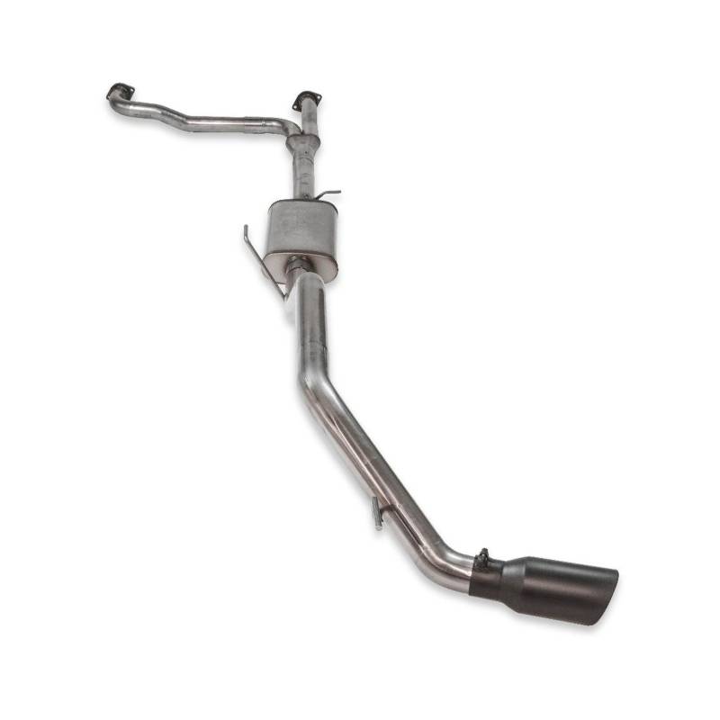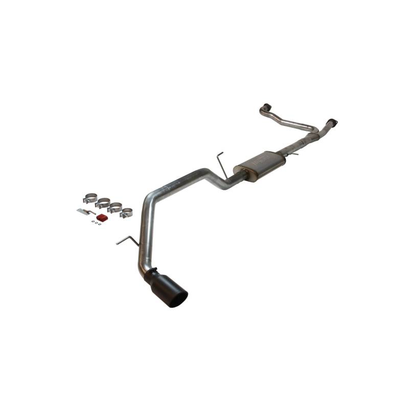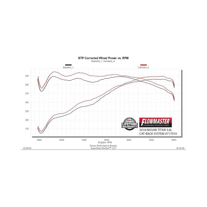 Introducing the new Flow FX® Cat-back exhaust system for the 2017-2024 Nissan Titan with the 5.6L engine. This performance exhaust system bolts up to the factory cat pipes with large dual 2.5-inch mandrel-bent tubing flowing into a Scavenger Series® Y-pipe for maximum flow. Our exclusive Scavenger Y-pipe creates a stronger signal than conventional y-pipes, by using two D-shaped ports back to back, giving a larger surface area than just two round pipes joined together. This creates a much stronger scavenging affect to help evacuate the cylinders during the exhaust stroke netting more power and torque. This is especially important for towing. The system flows out of the Scavenger series collector into 3-inch stainless steel tubing and the "straight-through" Flow FX muffler, which has a very deep powerful sound outside the vehicle, with moderate tone inside the cab. The mandrel-bent tailpipe exits behind the passenger side rear tire and is finished off with a large 4.50-inch black ceramic coated exhaust tip embossed with the Flowmaster® name. The system utilizes the factory hanger locations and connections and includes all necessary parts, hardware and detailed instructions for an easy at home installation. Notes: Fits 2/4 Wheel drive and all wheelbases. Does Not fit XD models.
