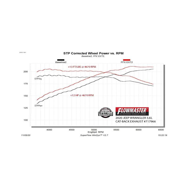 Flowmaster introduces our new Flow FX Extreme stainless steel cat-back exhaust system for the 2018-2026 Jeep Wrangler JL with the 3.6L engine. This system uses a Flow FX series muffler for a deep powerful sound and increased performance. 3.0-inch mandrel bent 409 stainless steel tubing is used for maximum exhaust flow and durability. Gain up to 12 hp and 13 lbs-ft of torque at the rear wheels. The system has a turndown style dump exit right after the muffler to eliminate the over-axle tailpipe. This elimination of the tailpipe helps to improve ground clearance and departure angle when you are driving in more extreme off-road situations. All of the necessary hardware is included and factory mounting locations are used for an easy installation. Backed by Flowmaster's Lifetime Limited Warranty.