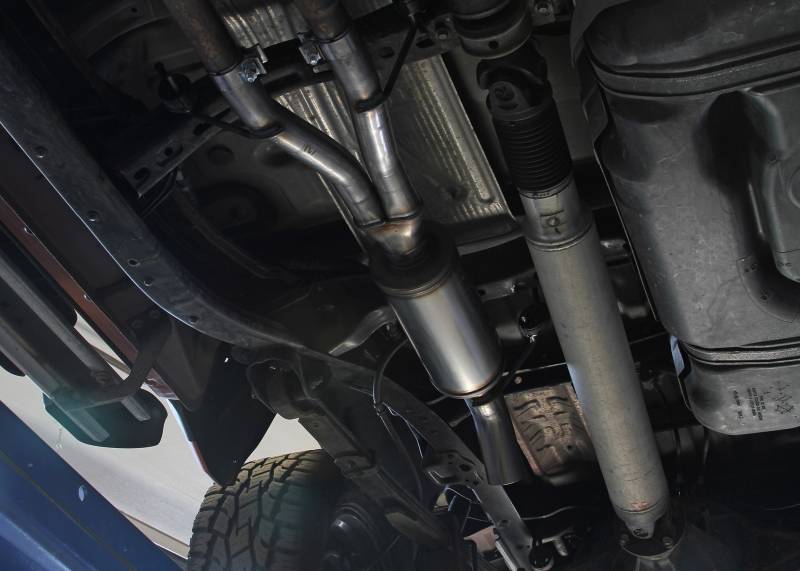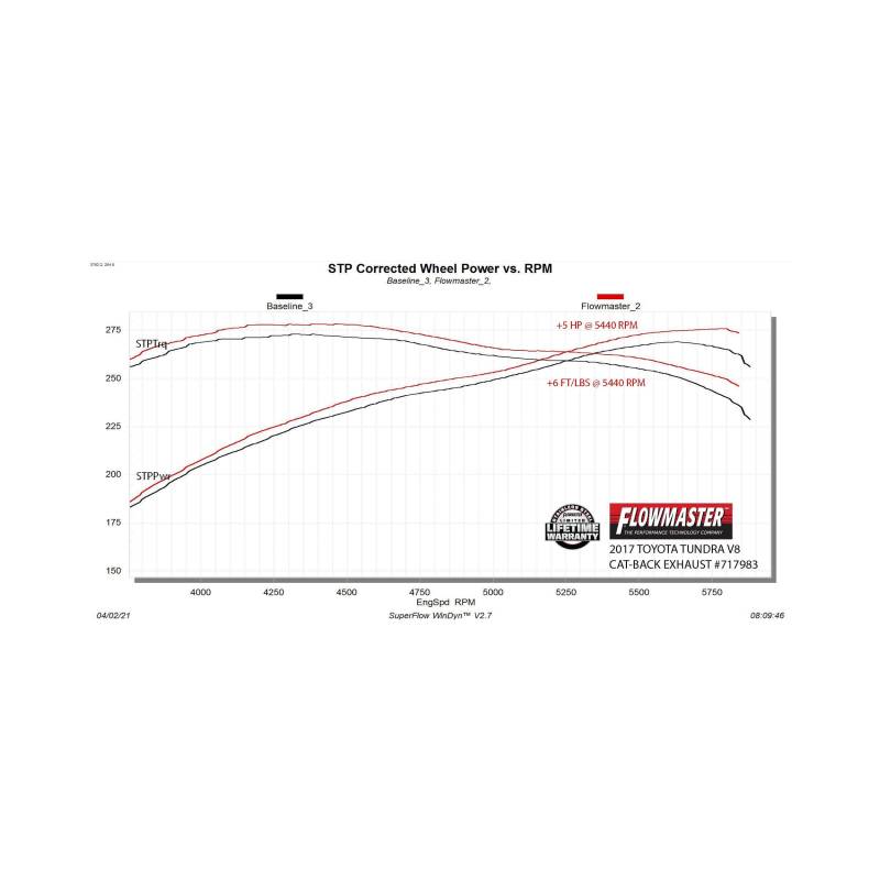 Flowmaster introduces our Flow FX Extreme stainless steel cat-back exhaust system for the 2007-2021 Toyota Tundra with the 4.7 or 5.7-liter engine. This system uses a Flow FX series muffler for an aggressive to moderate sound level and increased performance. 3.00-inch mandrel bent 409 stainless steel tubing allows for maximum exhaust flow and durability. The system has a turndown style, dump exit right after the muffler to eliminate the over-axle tailpipe. This elimination of the tailpipe helps improve ground clearance and departure angle when you are driving in more extreme off-road situations. This system produced max dyno gains of 5 hp and 6 lb-ft of torque at the rear wheels. All of the necessary hardware is included, and factory-mounting locations are used for an easy installation. Backed by Flowmaster's Lifetime Limited Warranty